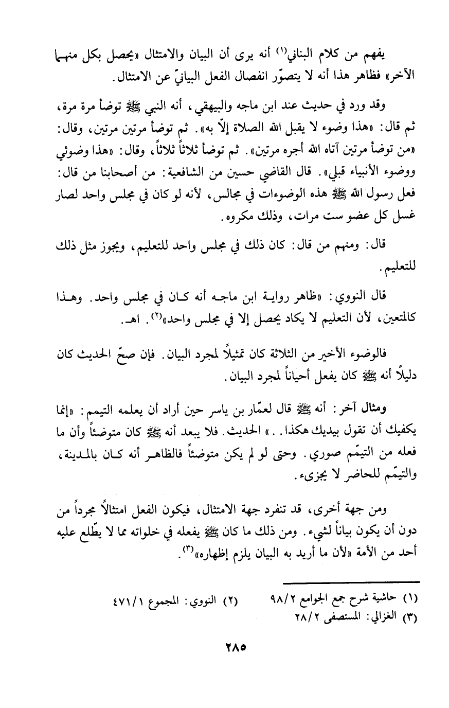 ومن جهة أخرى، قد تنفرد جهة الامتثال، فيكون الفعل امتثالاً مجرداً من دون أن يكون بياناً لشيء. ومن ذلك ما كان - صلى الله عليه وسلم - يفعله في خلواته مما لا يطّلع عليه أحد من الأمة "لأن ما أريد به البيان يلزم إظهاره" (٣).