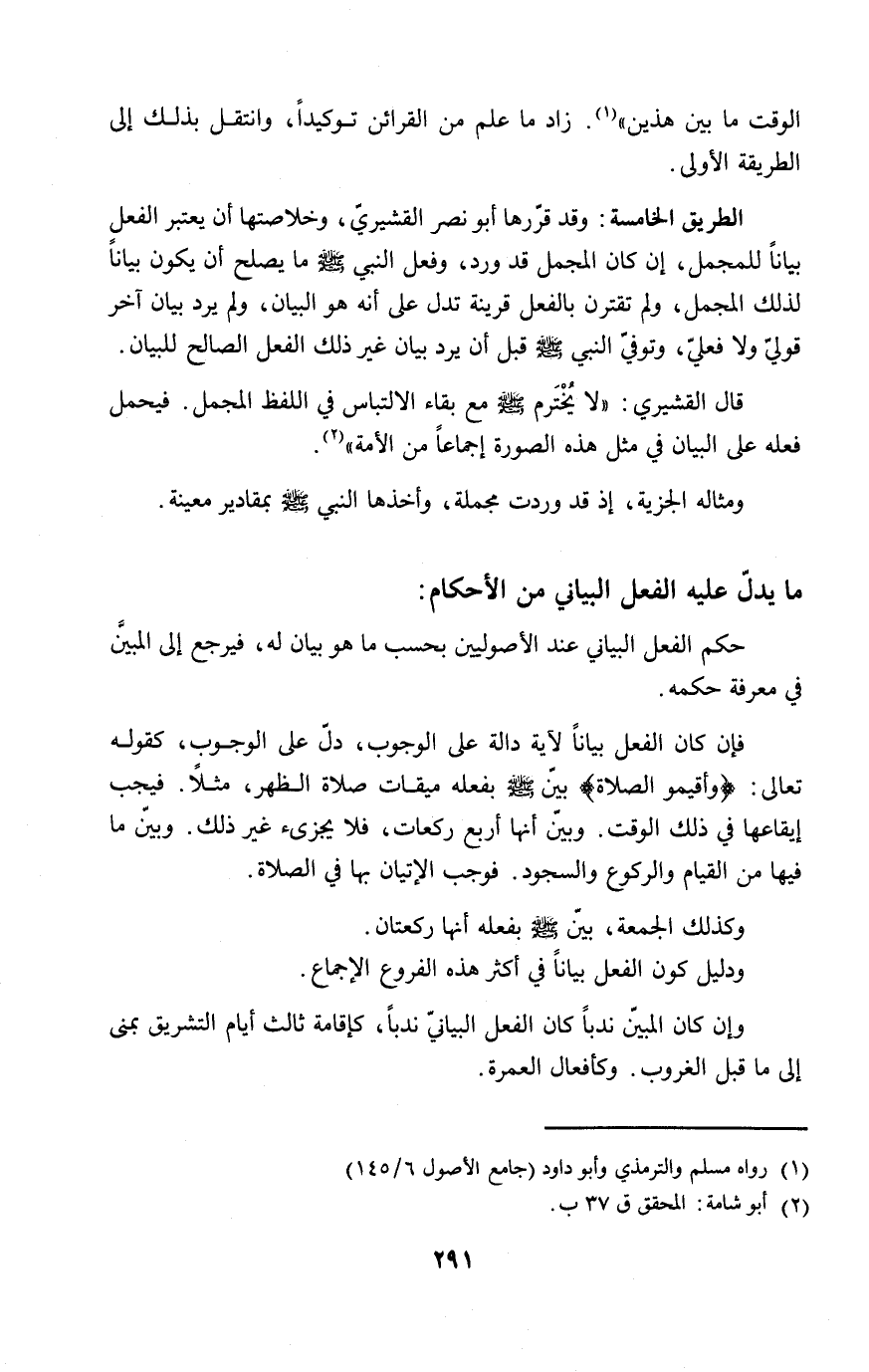الطريق الخامسة: وقد قرّرها أبو نصر القشيريّ، وخلاصتها أن يعتبر الفعل بياناً للمجمل، إن كان المجمل قد ورد، وفعل النبي - صلى الله عليه وسلم - ما يصلح أن يكون بياناً لذلك المجمل، ولم تقترن بالفعل قرينة تدل على أنه هو البيان، ولم يرد بيان آخر قولين ولا فعليّ، وتوفيّ النبي - صلى الله عليه وسلم - قبل أن يرد بيان غير ذلك الفعل الصالح للبيان.