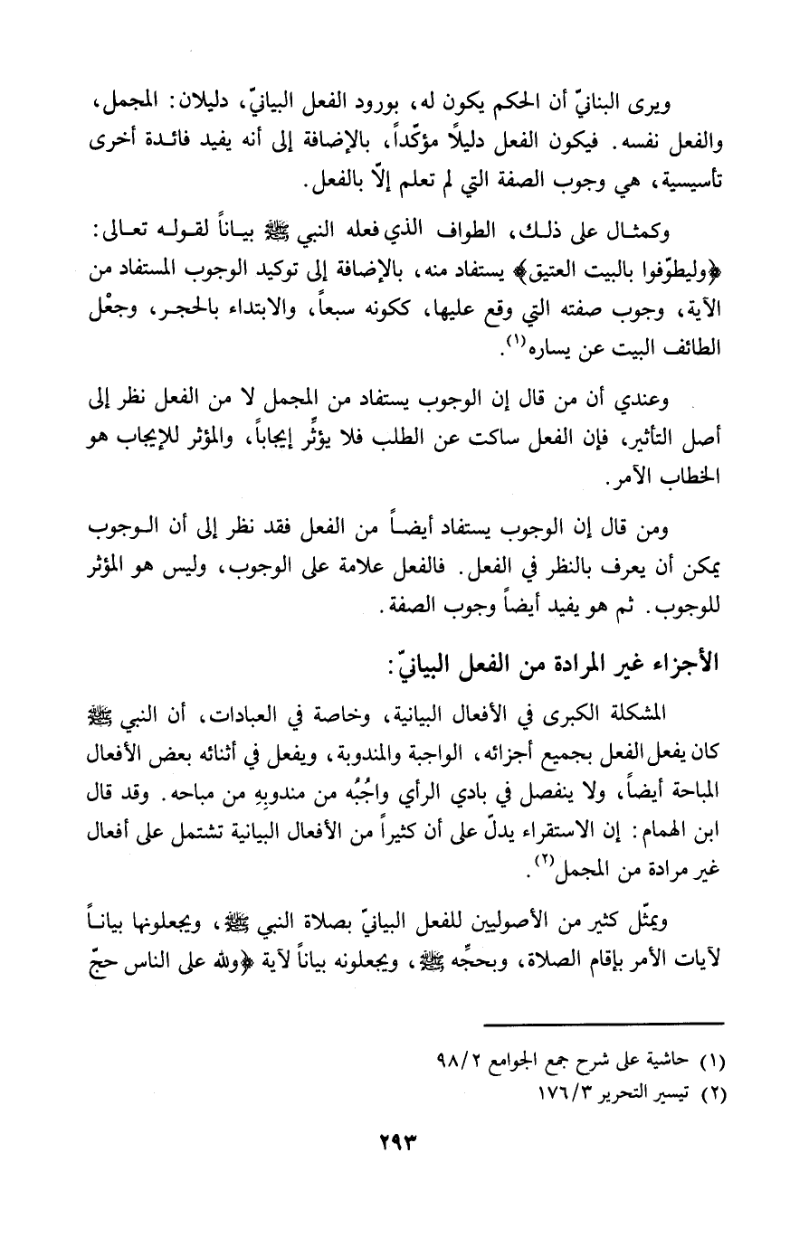 وكمثال على ذلك، الطواف الذي فعله النبي - صلى الله عليه وسلم - بياناً لقوله تعالى: {وليطوّفوا بالبيت العتيق} يستفاد منه، بالإضافة إلى توكيد الوجوب المستفاد من الآية، وجوب صفته التي وقع عليها، ككونه سبعاً، والابتداء بالحجر، وجعْل الطائف البيت عن يساره (١).