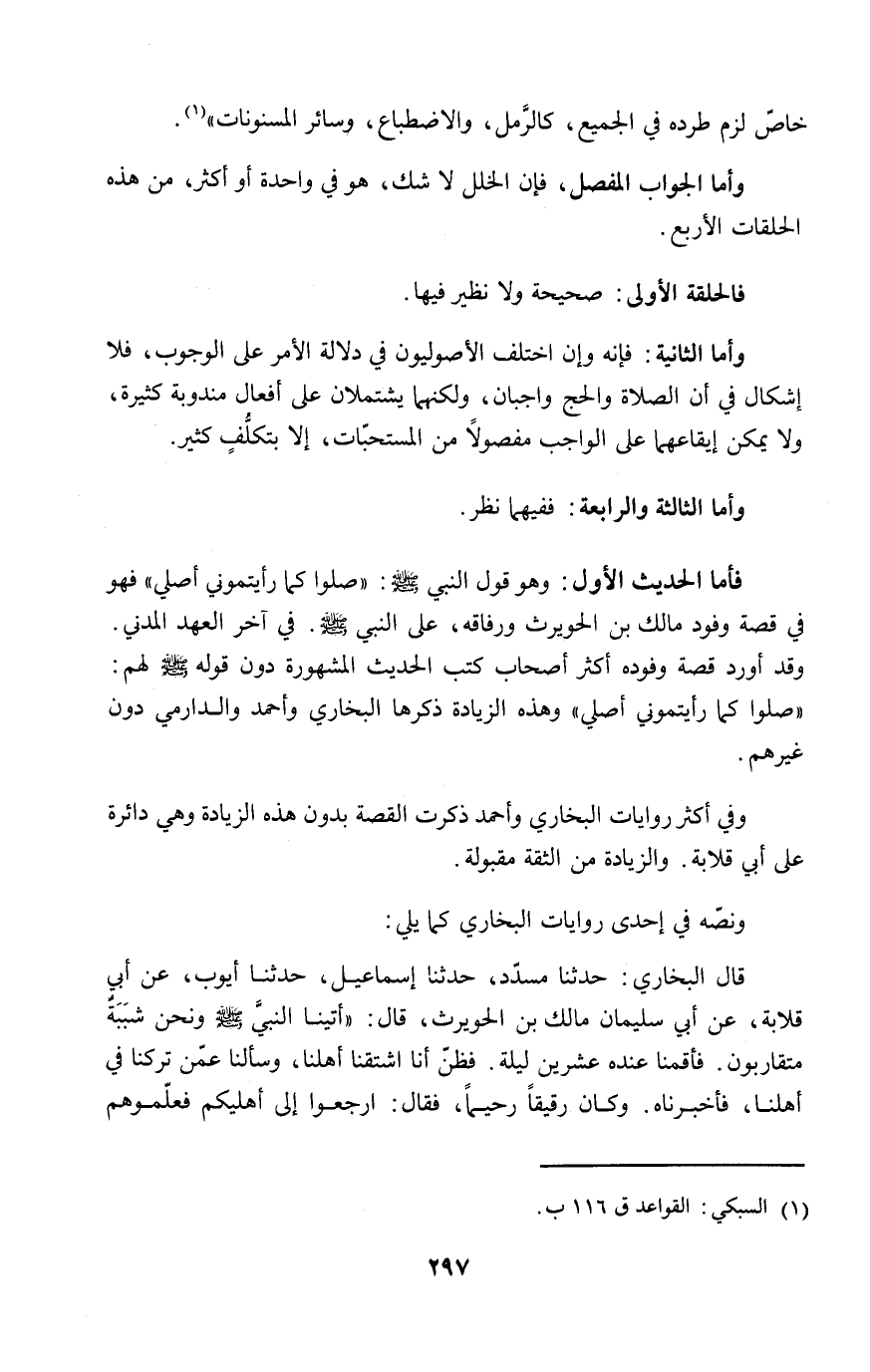 فأما الحديث الأول: وهو قول النبي - صلى الله عليه وسلم -: "صلوا كما رأيتموني أصلي" فهو في قصة وفود مالك بن الحويرث ورفاقه، على النبي - صلى الله عليه وسلم -. في آخر العهد المدني. وقد أورد قصة وفوده أكثر أصحاب كتب الحديث المشهورة دون قوله - صلى الله عليه وسلم - لهم: "صلوا كما رأيتموني أصلي" وهذه الزيادة ذكرها البخاري وأحمد والدارمي دون غيرهم.