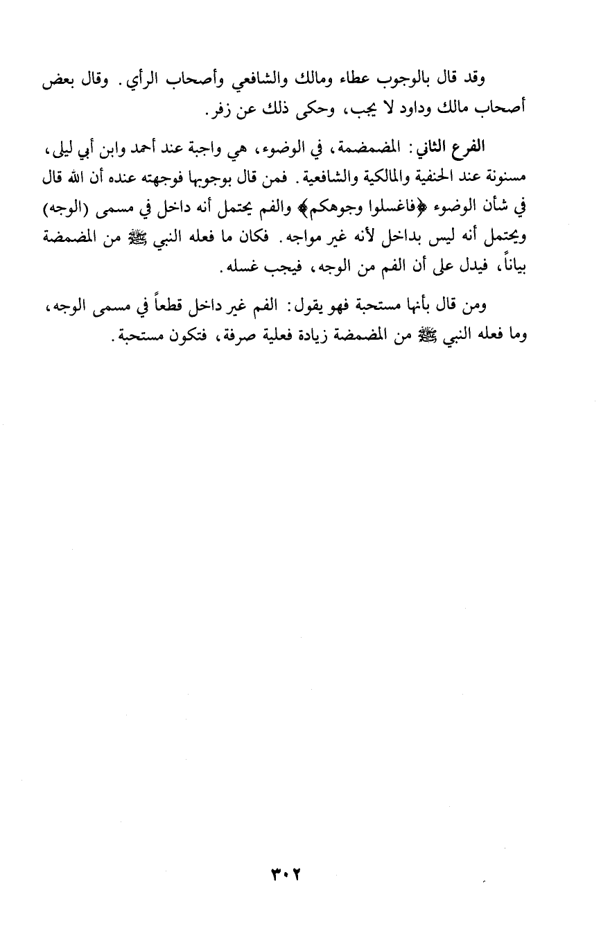 الفرع الثاني: المضمضمة، في الوضوء، هي واجبة عند أحمد وابن أبي ليلى، مسنونة عند الحنفية والمالكية والشافعية. فمن قال بوجوبها فوجهته عنده أن الله قال في شأن الوضوء {فاغسلوا وجوهكم} والفم يحتمل أنه داخل في مسمى (الوجه) ويحتمل أنه ليس بداخل لأنه غير مواجه. فكان ما فعله النبي - صلى الله عليه وسلم - من المضمضة بياناً، فيدل على أن الفم من الوجه، فيجب غسله.