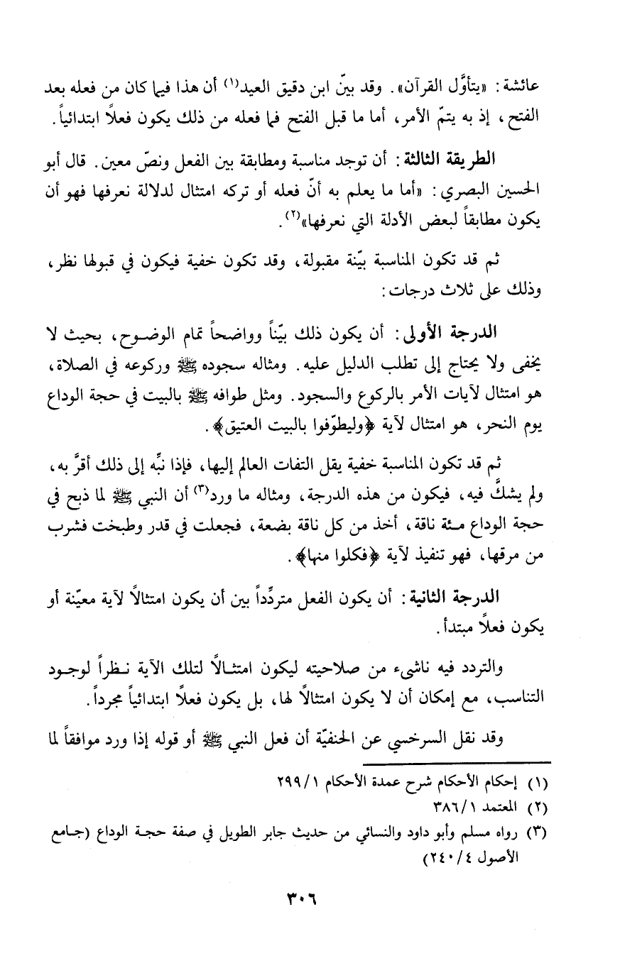 الطريقة الثانية: أن توجد مناسبة ومطابقة بين الفعل ونصّ معين. قال أبو الحسين البصري: "أما ما يعلم به أنّ فعله أو تركه امتثال لدلالة نعرفها فهو أن يكون مطابقاً لبعض الأدلة التي نعرفها" (٢).