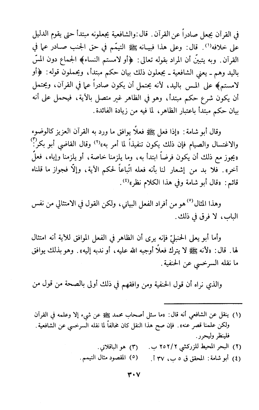 (١) ينقل عن الشافعي أنه قال: "ما سئل أصحاب محمد - صلى الله عليه وسلم - عن شيء إلا وعلمه في القرآن ولكن علمنا قصر عنه". فإن صح هذا النقل كان مخالفاً لما نقله السرخسي عن الشافعية. فلينظر وليحرر.
