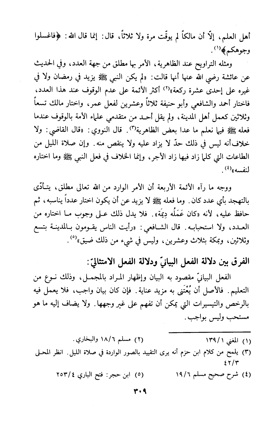 ومثله التراويح عند الظاهرية، الأمر بها مطلق من جهة العدد، وفي الحديث عن عائشة رضي الله عنها أنها قالت: "لم يكن النبي - صلى الله عليه وسلم - يزيد في رمضان ولا في غيره على إحدى عشرة ركعة" (٢) أكثر الأئمة على عدم الوقوف عند هذا العدد، فاختار أحمد والشافعي وأبو حنيفة ثلاثاً وعشرين لفعل عمر، واختار مالك تسعاً وثلاثين كعمل أهل المدينة، ولم يقل أحد من متقدمي علماء الأمة بالوقوف عندما فعله - صلى الله عليه وسلم - فيما نعلم ما عدا بعض الظاهرية (٣). قال النووي: "قال القاضي: ولا خلاف أنه ليس في ذلك حدّ لا يزاد عليه ولا ينقص منه. وإن صلاة الليل من الطاعات التي كلما زاد فيها زاد الأجر، وإنما الخلاف في فعل النبي - صلى الله عليه وسلم - وما اختاره لنفسه" (٤).