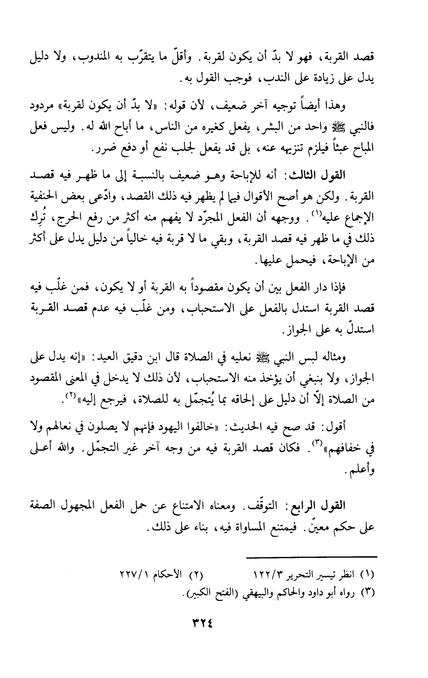 القول الثالث: أنه للإباحة وهو ضعيف بالنسبة إلى ما ظهر فيه قصد القربة. ولكن هو أصح الأقوال فيما لم يظهر فيه ذلك القصد، وادّعى بعض الحنفية الإجماع عليه (١). ووجهه أن الفعل المجرد لا يفهم منه أكثر من رفع الحرج، تُرِك ذلك في ما ظهر فيه قصد القربة، وبقي ما لا قربة فيه خالياً من دليل يدل على أكثر من الإباحة، فيحمل عليها.