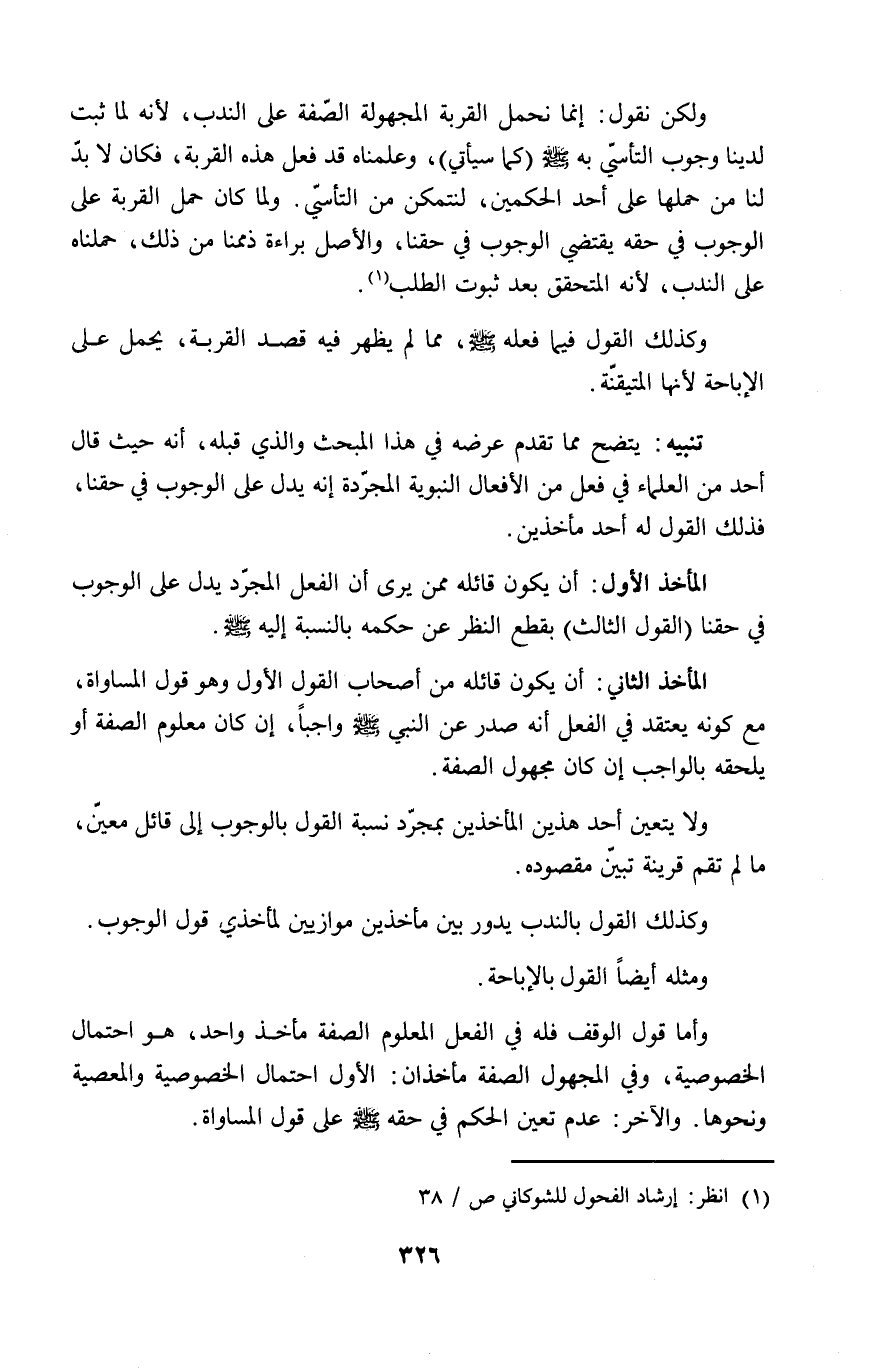 تنبيه: يتضح مما تقدم عرضه في هذا المبحث والذي قبله، أنه حيث قال أحد من العلماء في فعل من الأفعال النبوية المجردة إنه يدل على الوجوب في حقنا، فذلك القول له أحد مأخذين.