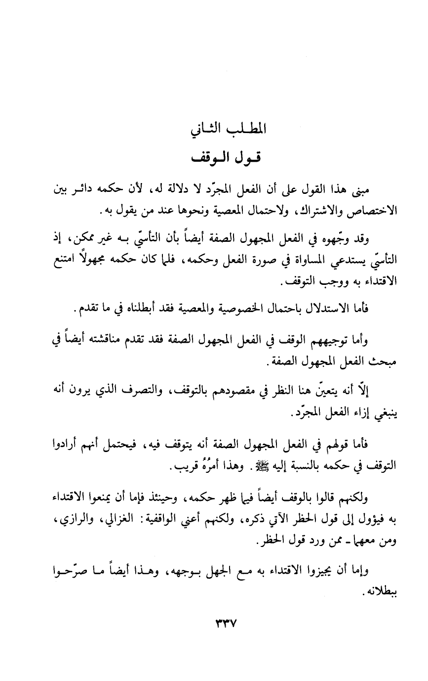 ولكنهم قالوا بالوقف أيضاً فيما ظهر حكمه، وحينئذ فإما أن يمنعوا الاقتداء به فيؤول إلى قول الحظر الآتي ذكره، ولكنهم أعني الواقفية: الغزالي، والرازي، ومن معهما- ممن ورد قول الحظر.