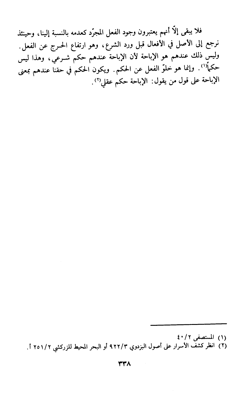 فلا يبقى إلاّ أنهم يعتبرون وجود الفعل المجرّد كعدمه بالنسبة إلينا، وحينئذ نرجع إلى الأصل في الأفعال قبل ورد الشرع، وهو ارتفاع الحرج عن الفعل. وليس ذلك عندهم هو الإباحة لأن الإباحة عندهم حكم شرعي، وهذا ليس حكماً (١). وانما هو خلوّ الفعل عن الحكم. ويكون الحكم في حقنا عندهم بمعنى الإباحة على قول من يقول: الإباحة حكم عقلي (٢).