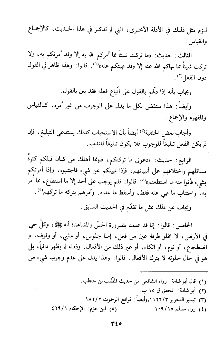 الرابع: حديث: "دعوني ما تركتكم، فإنما أهلكَ من كان قبلكم كثرةُ مسائلهم واختلافهم على أنبيائهم، فإذا نهيتكم عن شيء فاجتنبوه، وإذا أمرتكم بشيء فأتوا منه ما استطعتم" (٤) قالوا: فلم يوجب على أحد إلا ما استطاع، مما أُمر به، واجتناب ما نهي عنه فقط، وأسقط ما عداه. وأمرهم بتركه ما تركهم (٥).