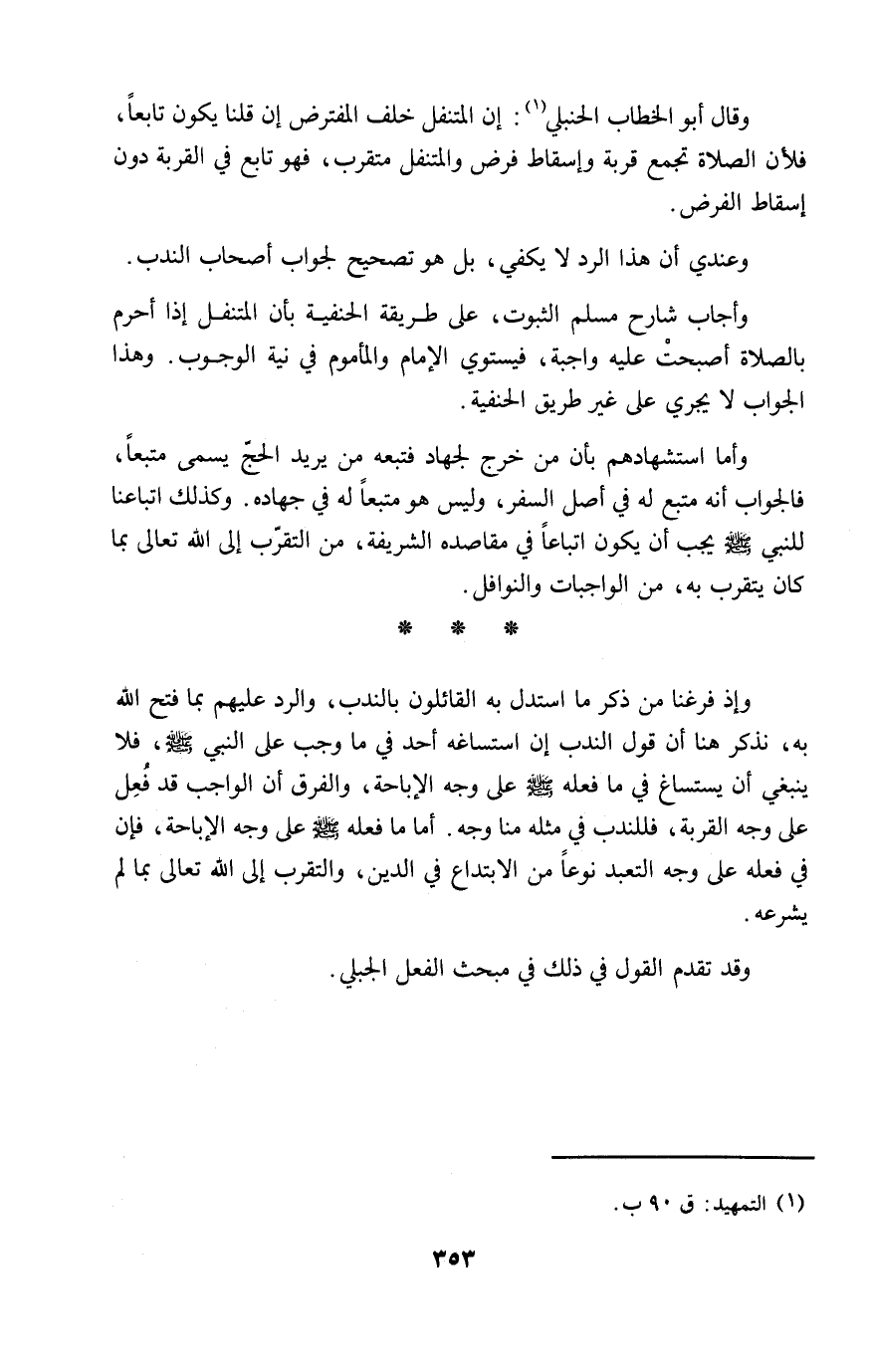 وأما استشهادهم بأن من خرج لجهاد فتبعه من يريد الحجّ يسمى متبعاً، فالجواب أنه متبع له في أصل السفر، وليس هو متبعاً له في جهاده. وكذلك اتباعنا للنبي - صلى الله عليه وسلم - يجب أن يكون اتباعاً في مقاصده الشريفة، من التقرّب إلى الله تعالى بما كان يتقرب به، من الواجبات والنوافل.