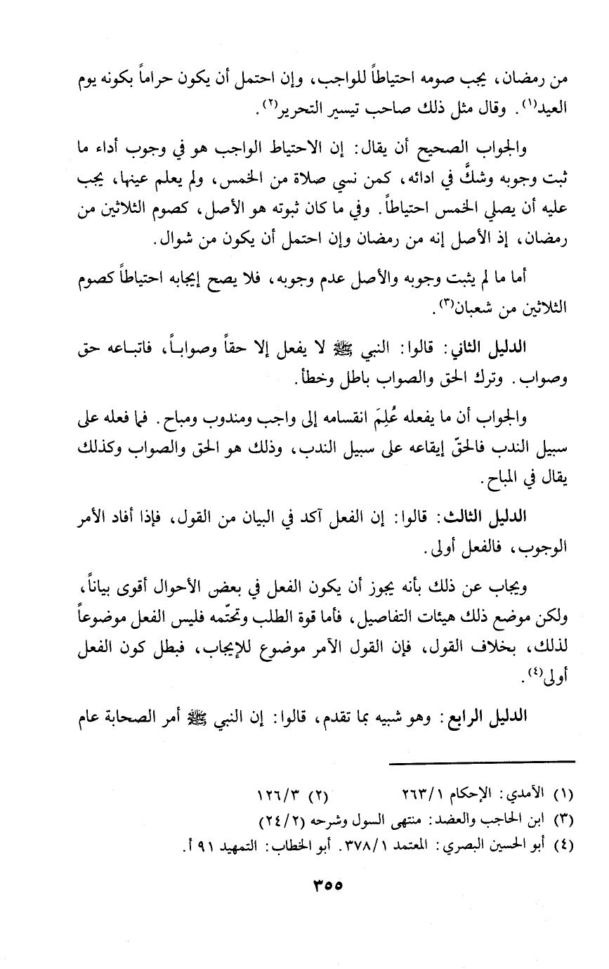 ويجاب عن ذلك بأنه يجوز أن يكون الفعل في بعض الأحوال أقوى بياناً، ولكن موضع ذلك هيئات التفاصيل، فأما قوة الطلب وتحتّمه فليس الفعل موضوعاً لذلك، بخلاف القول، فإن القول الآمر موضوع للإيجاب، فبطل كون الفعل أولى (٤).
