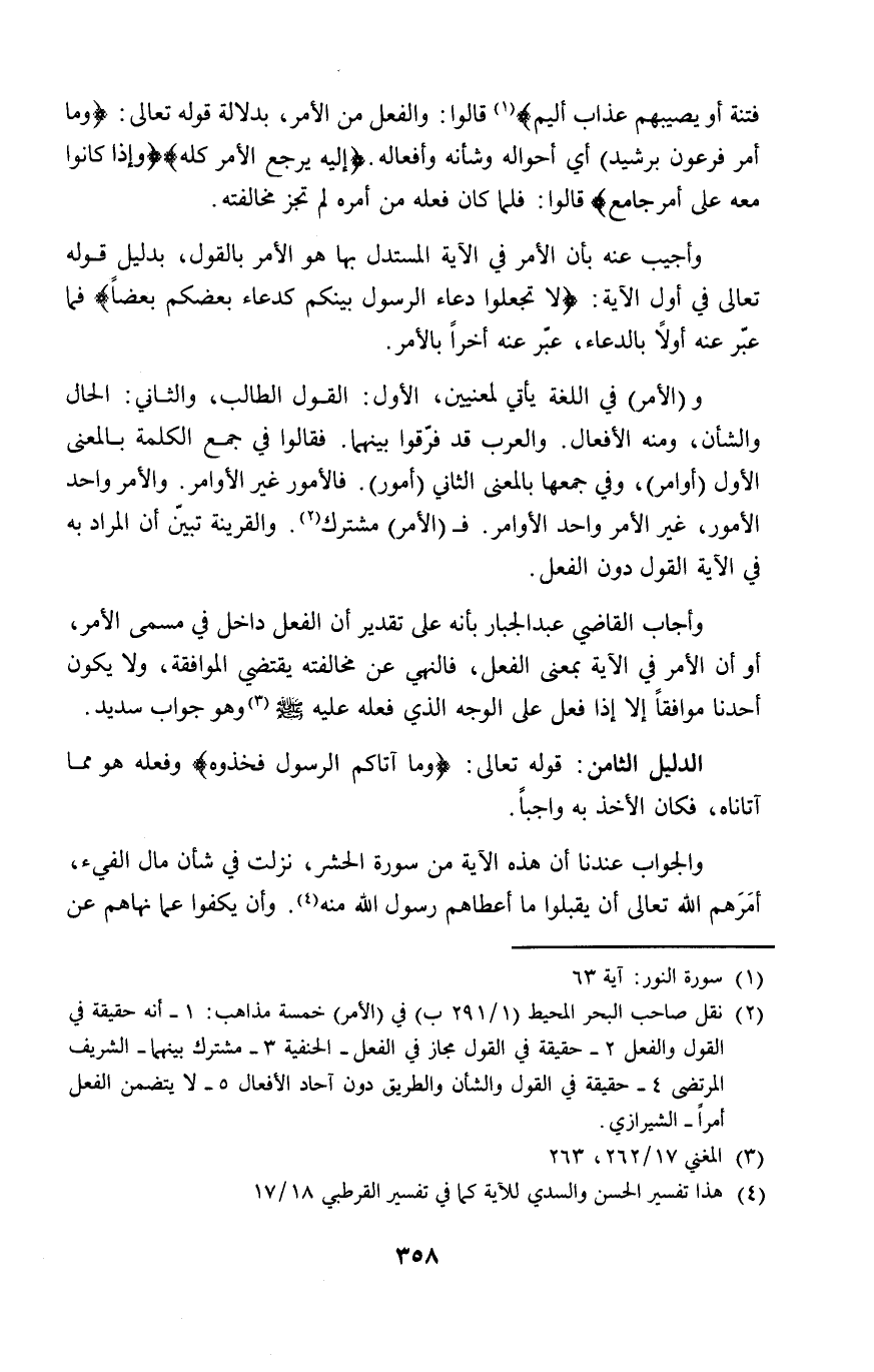 فتنة أو يصيبهم عذاب أليم} (١) قالوا: والفعل من الأمر، بدلالة قوله تعالى: {وما أمر فرعون برشيد} أي أحواله وشأنه وأفعاله. {إليه يرجع الأمر كله} {وإذا كانوا معه على أمر جامع} قالوا: فلما كان فعله من أمره لم تجز مخالفته.