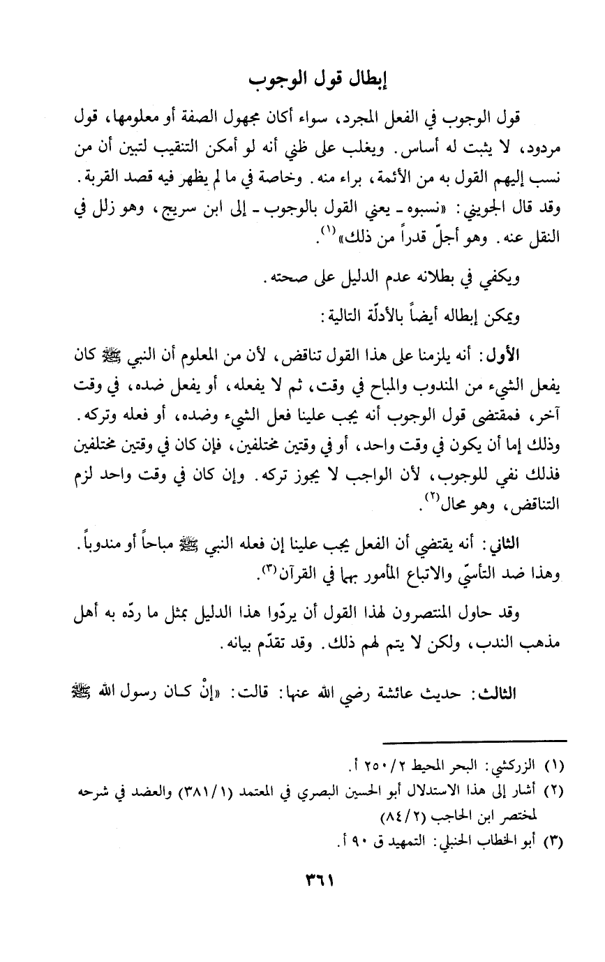 قول الوجوب في الفعل المجرد، سواء أكان مجهول الصفة أو معلومها، قول مردود، لا يثبت له أساس. ويغلب على ظني أنه لو أمكن التنقيب لتبين أن من نسب إليهم القول به من الأئمة، براء منه. وخاصة في ما لم يظهر فيه قصد القربة. وقد قال الجويني: "نسبوه -يعني القول بالوجوب- إلى ابن سريج، وهو زلل في النقل عنه. وهو أجلّ قدراً من ذلك" (١).