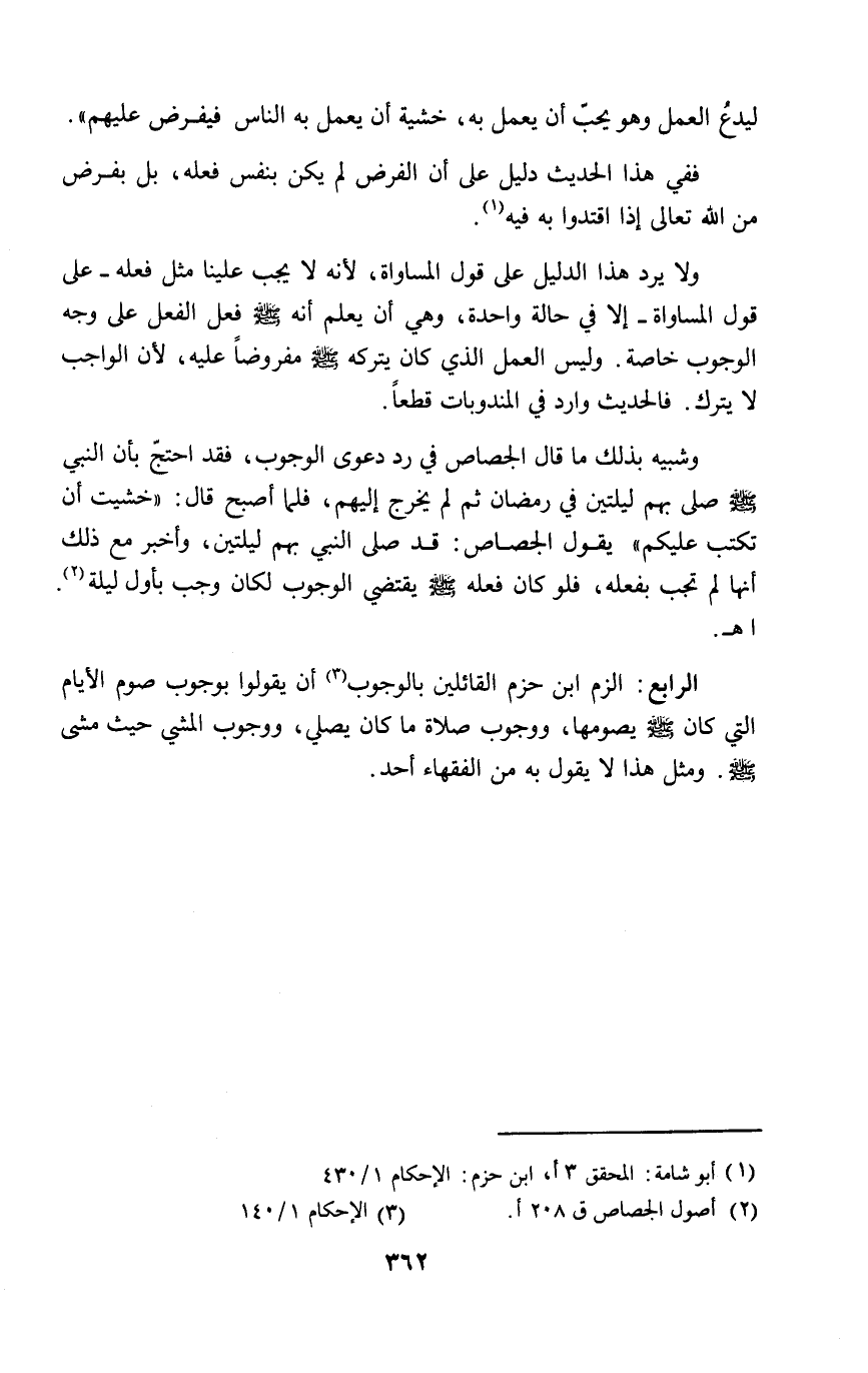 وشبيه بذلك ما قال الجصاص في رد دعوى الوجوب، فقد احتجّ بأن النبي - صلى الله عليه وسلم - صلى بهم ليلتين في رمضان ثم لم يخرج إليهم، فلما أصبح قال: "خشيت أن تكتب عليكم" يقول الجصاص: قد صلى النبي بهم ليلتين، وأخبر مع ذلك أنها لم تجب بفعله، فلو كان فعله - صلى الله عليه وسلم - يقتضي الوجوب لكان وجب بأول ليلة (٢) اهـ.