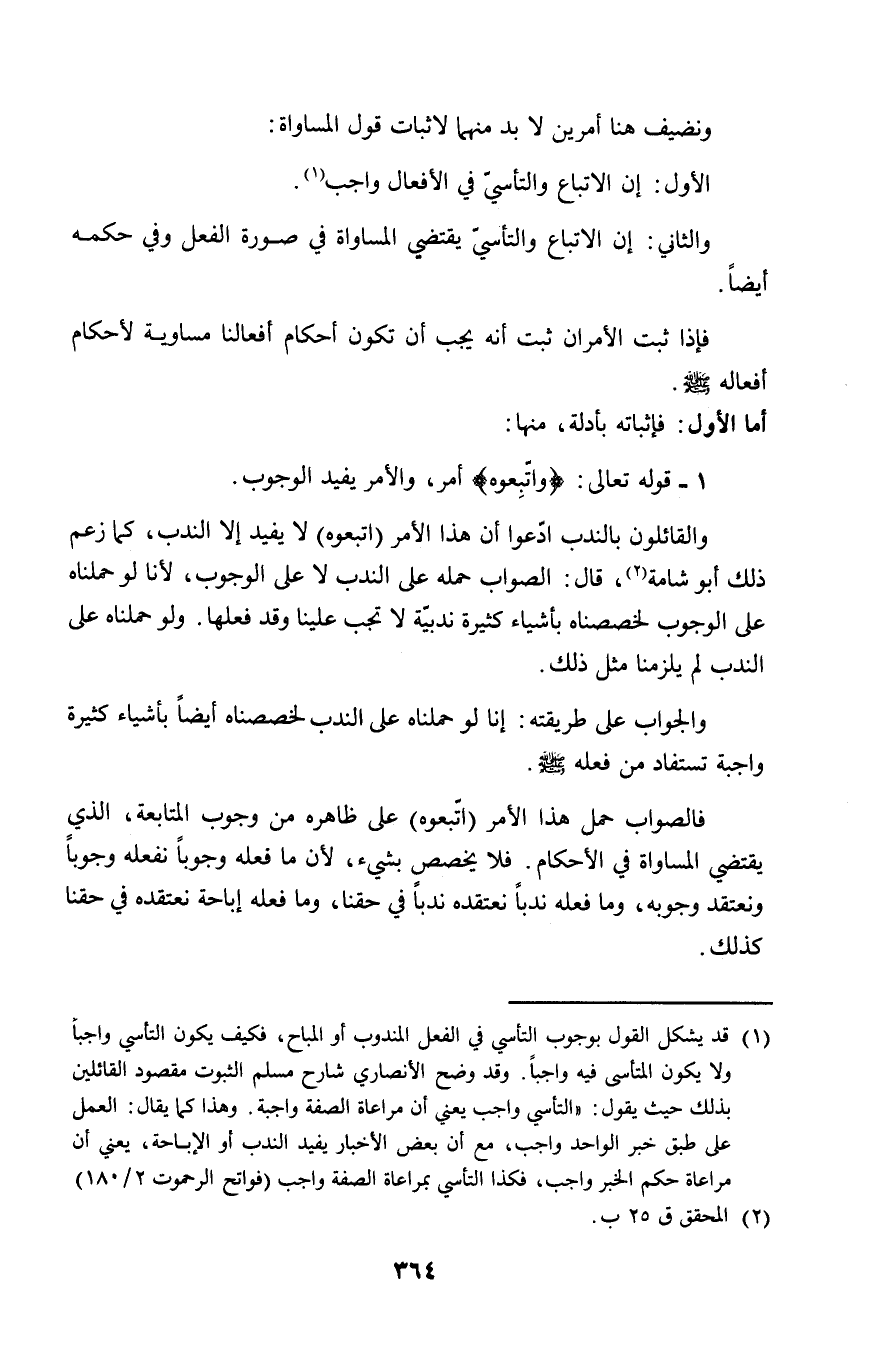 (١) قد يشكل القول بوجوب التأسّي في الفعل المندوب أو المباح، فكيف يكون التأسّي واجباً ولا يكون المتأسى فيه واجباً. وقد وضح الأنصاري شارح مسلم الثبوت مقصود القائلين بذلك حيث يقول: "التأسّي واجب يعني أن مراعاة الصفة واجبة. وهذا كما يقال: العمل على طبق خبر الواحد واجب، مع أن بعض الأخبار يفيد الندب أو الإباحة، يعني أن مراعاة حكم الخبر واجب، فكذا التأسّي بمراعاة الصفة واجب (فواتح الرحموت ٢/ ١٨٠)