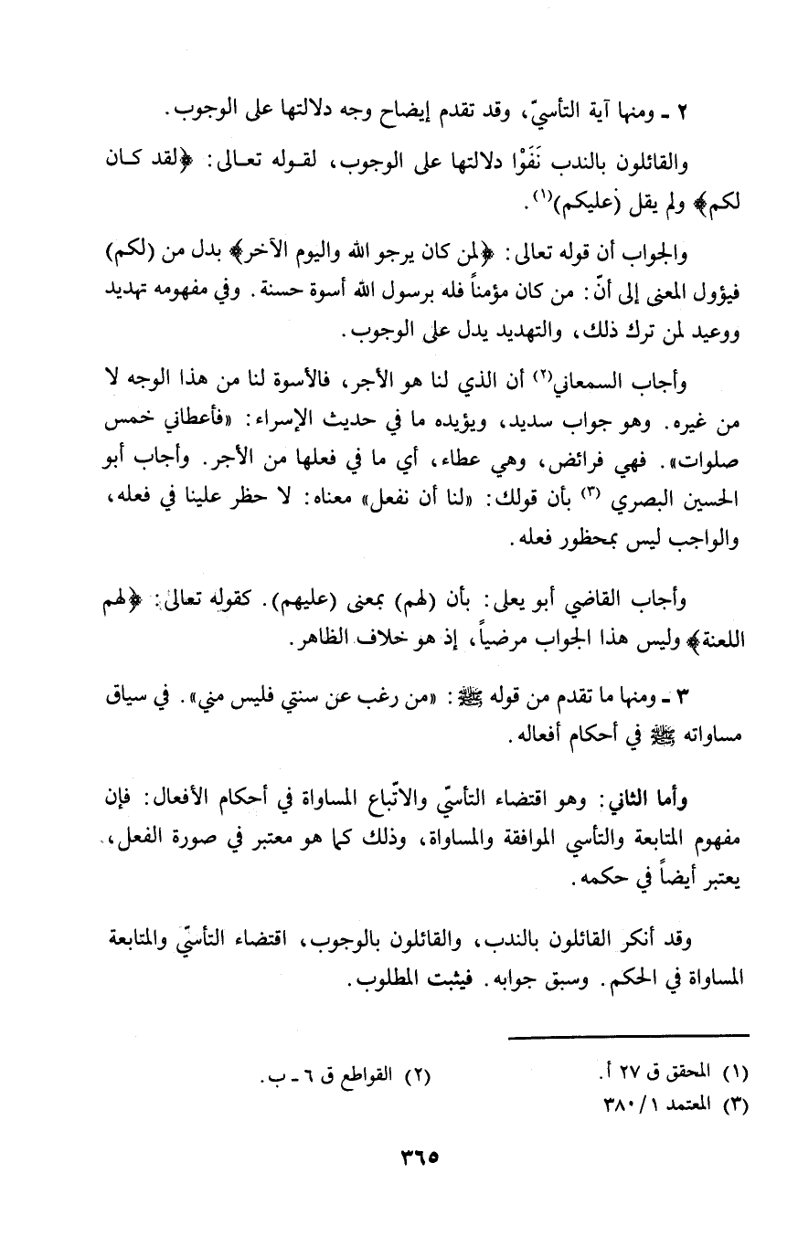 وأما الثاني: وهو اقتضاء التأسيّ والاتباع المساواة في أحكام الأفعال: فإن مفهوم المتابعة والتأسي الموافقة والمساواة، وذلك كما هو معتبر في صورة الفعل، يعتبر أيضاً في حكمه.