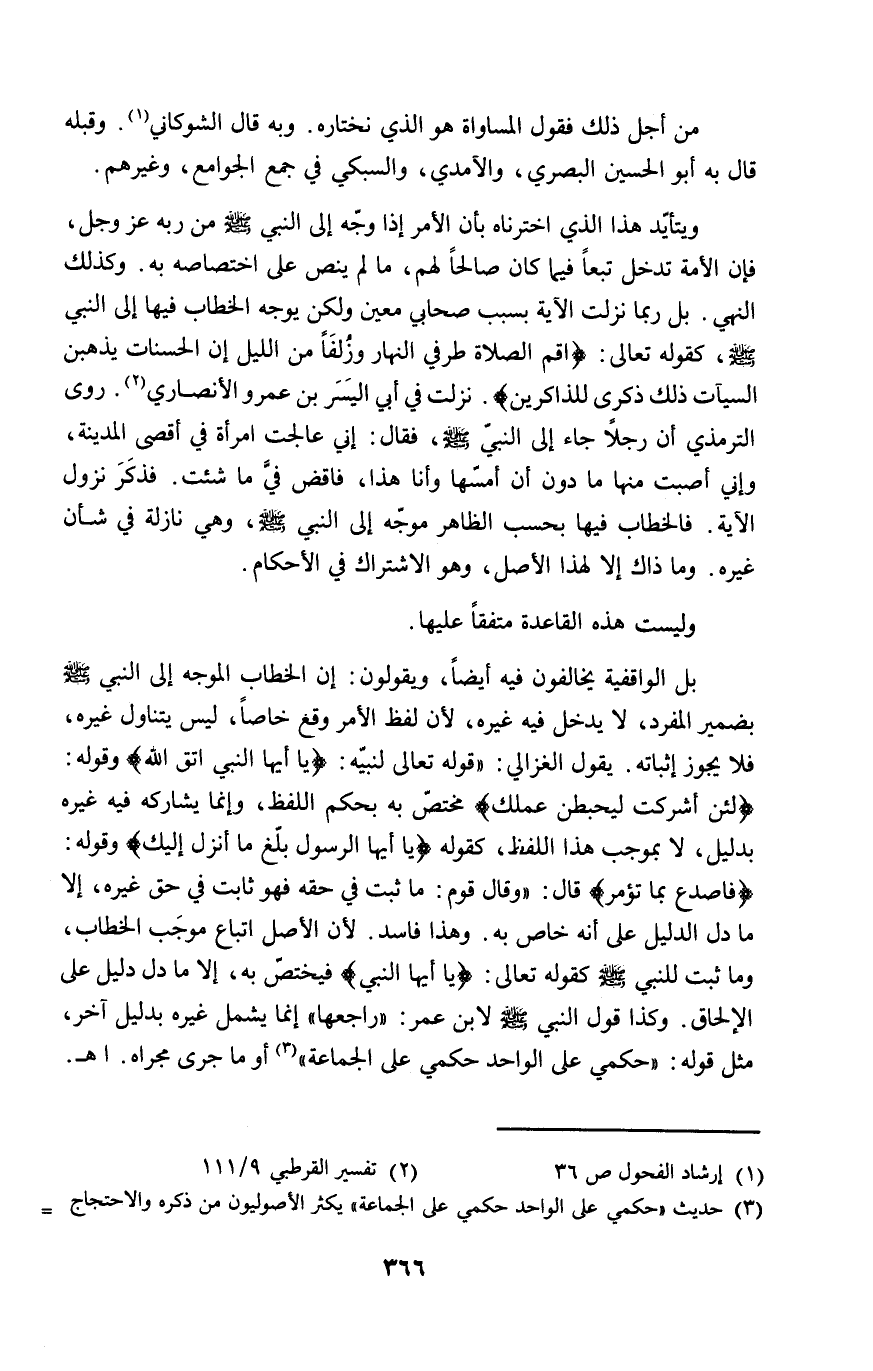 ويتأيّد هذا الذي اخترناه بأن الأمر إذا وجّه إلى النبي - صلى الله عليه وسلم - من ربه عز وجل، فإن الأمة تدخل تبعاً فيما كان صالحاً لهم، ما لم ينص على اختصاصه به. وكذلك النهي. بل ربما نزلت الآية بسبب صحابي معين ولكن يوجه الخطاب فيها إلى النبي - صلى الله عليه وسلم -، كقوله تعالى: {أقم الصلاة طرفي النهار وزُلفاً من الليل إن الحسنات يذهبن السيئات ذلك ذكرى للذاكرين}. نزلت في أبي اليسَر بن عمرو الأنصاري (٢). روى الترمذي أن رجلاً جاء إلى النبيّ - صلى الله عليه وسلم -، فقال: إني عالجت امرأة في أقصى المدينة، وإني أصبت منها ما دون أن أمسّها وأنا هذا، فاقض فيَّ ما شئت. فذكَرَ نزول الآية. فالخطاب فيها بحسب الظاهر موجّه إلى النبي - صلى الله عليه وسلم -، وهي نازلة في شأن غيره. وما ذاك إلا لهذا الأصل، وهو الاشتراك في الأحكام.