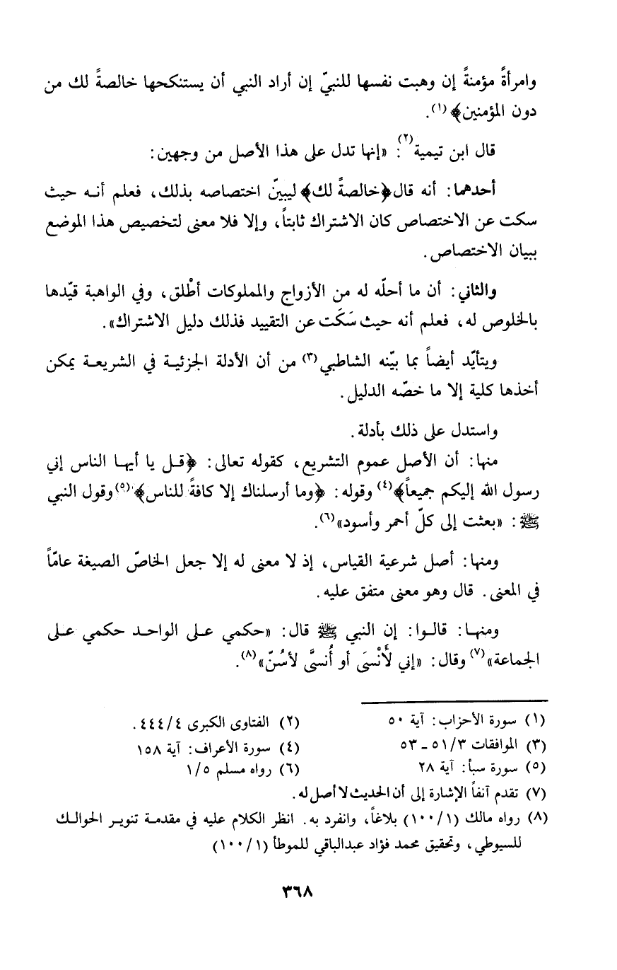منها: أن الأصل عموم التشريع، كقوله تعالى: {قل يا أيها الناس إني رسول الله إليكم جميعاً} (٤) وقوله: {وما أرسلناك إلا كافةً للناس} (٥) وقول النبي - صلى الله عليه وسلم -: "بعثت إلى كلّ أحمر وأسود" (٦).