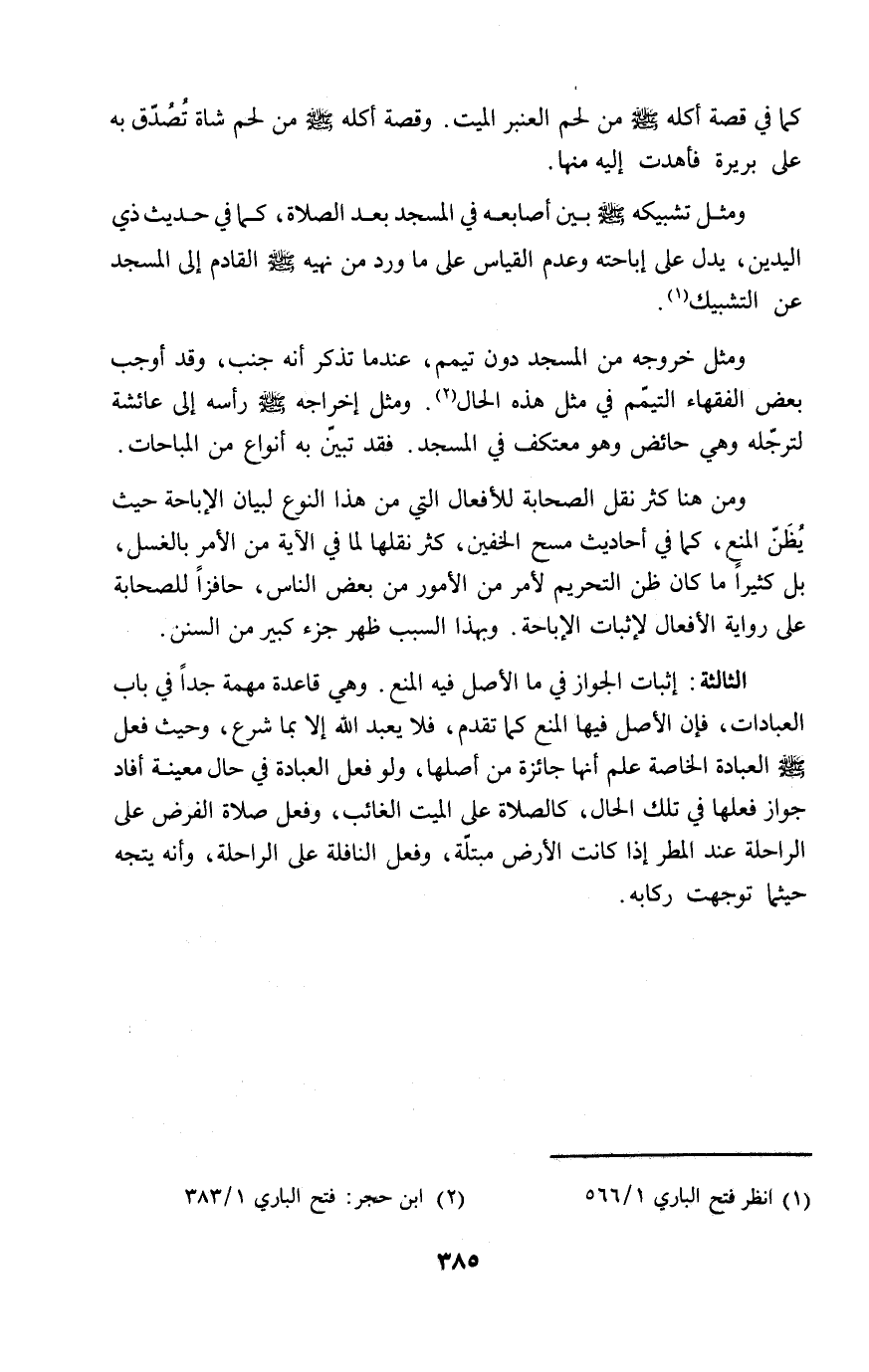 الثالثة: إثبات الجواز في ما الأصل فيه المنع. وهي قاعدة مهمة جداً في باب العبادات، فإن الأصل فيها المنع كما تقدم، فلا يعبد الله إلا بما شرع، وحيث فعل - صلى الله عليه وسلم - العبادة الخاصة علم أنها جائزة من أصلها، ولو فعل العبادة في حال معينة أفاد جواز فعلها في تلك الحال، كالصلاة على الميت الغائب، وفعل صلاة الفرض على الراحلة عند المطر إذا كانت الأرض مبتلّة، وفعل النافلة على الراحلة، وأنه يتجه حيثما توجهت ركابه.
