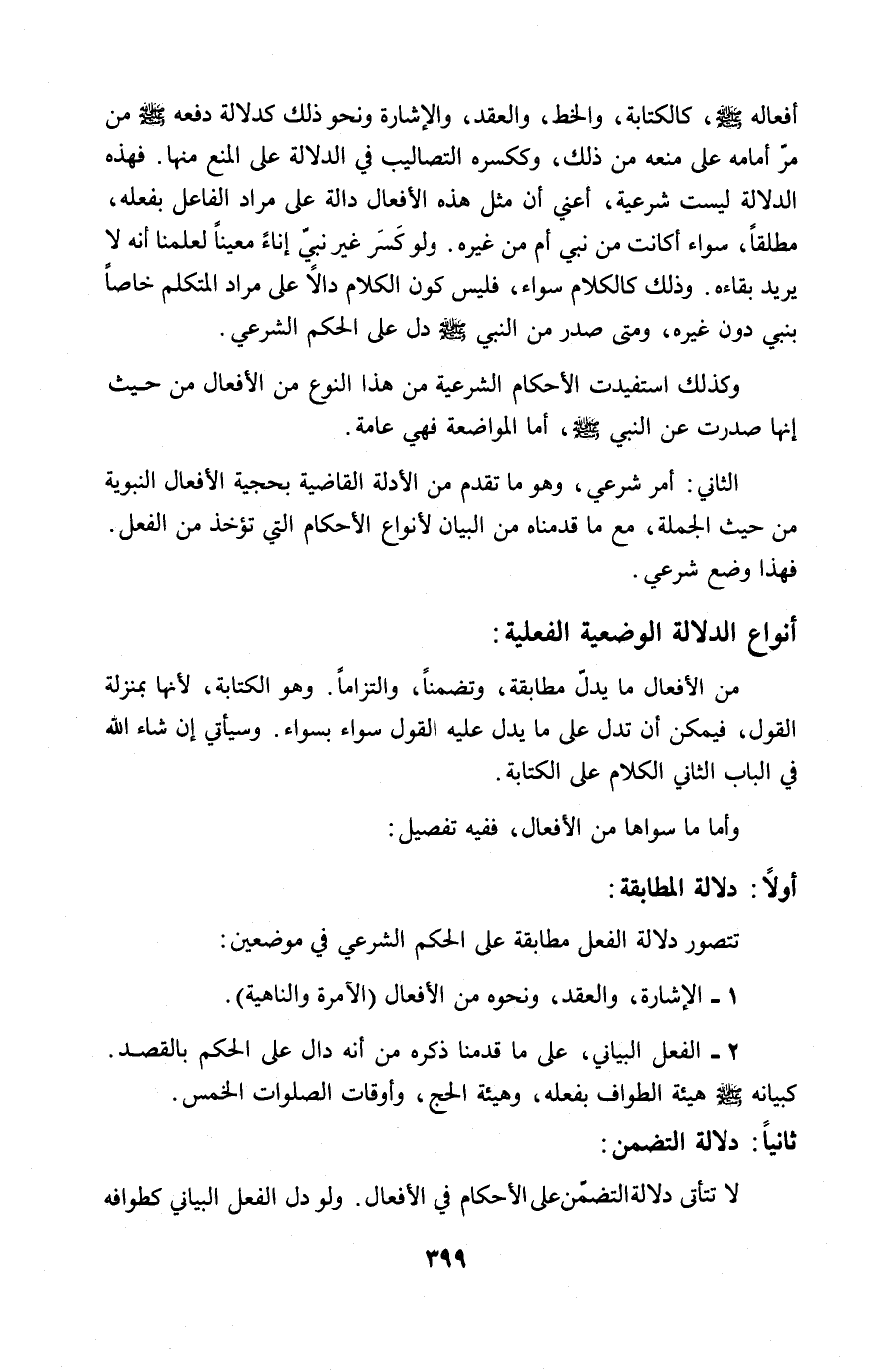 أفعاله - صلى الله عليه وسلم -، كالكتابة، والخط، والعقد، والإشارة ونحو ذلك كدلالة دفعه - صلى الله عليه وسلم - من مرّ أمامه على منعه من ذلك، وككسره التصاليب في الدلالة على المنع منها. فهذه الدلالة ليست شرعية، أعني أن مثل هذه الأفعال دالة على مراد الفاعل بفعله، مطلقاً، سواء أكانت من نبي أم من غيره. ولو كَسَر غير نبيّ إناءً معيناً لعلمنا أنه لا يريد بقاءه. وذلك كالكلام سواء، فليس كون الكلام دالاً على مراد المتكلم خاصاً بنبي دون غيره، ومتى صدر من النبي - صلى الله عليه وسلم - دل على الحكم الشرعي.