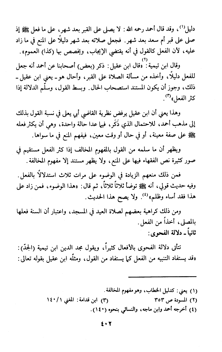 وقال ابن تيمية: (٢) "قال ابن عقيل: ذكر (بعض) أصحابنا عن أحمد أنه جعل للفعل دليلاً، وأخذه من مسألة الصلاة على القبر، وأحال هو -يعني ابن عقيل- ذلك، وجوز أن يكون المستند استصحاب الحال. وبسط القول، وسلّم الدلالة إذا كثر الفعل" (٣).