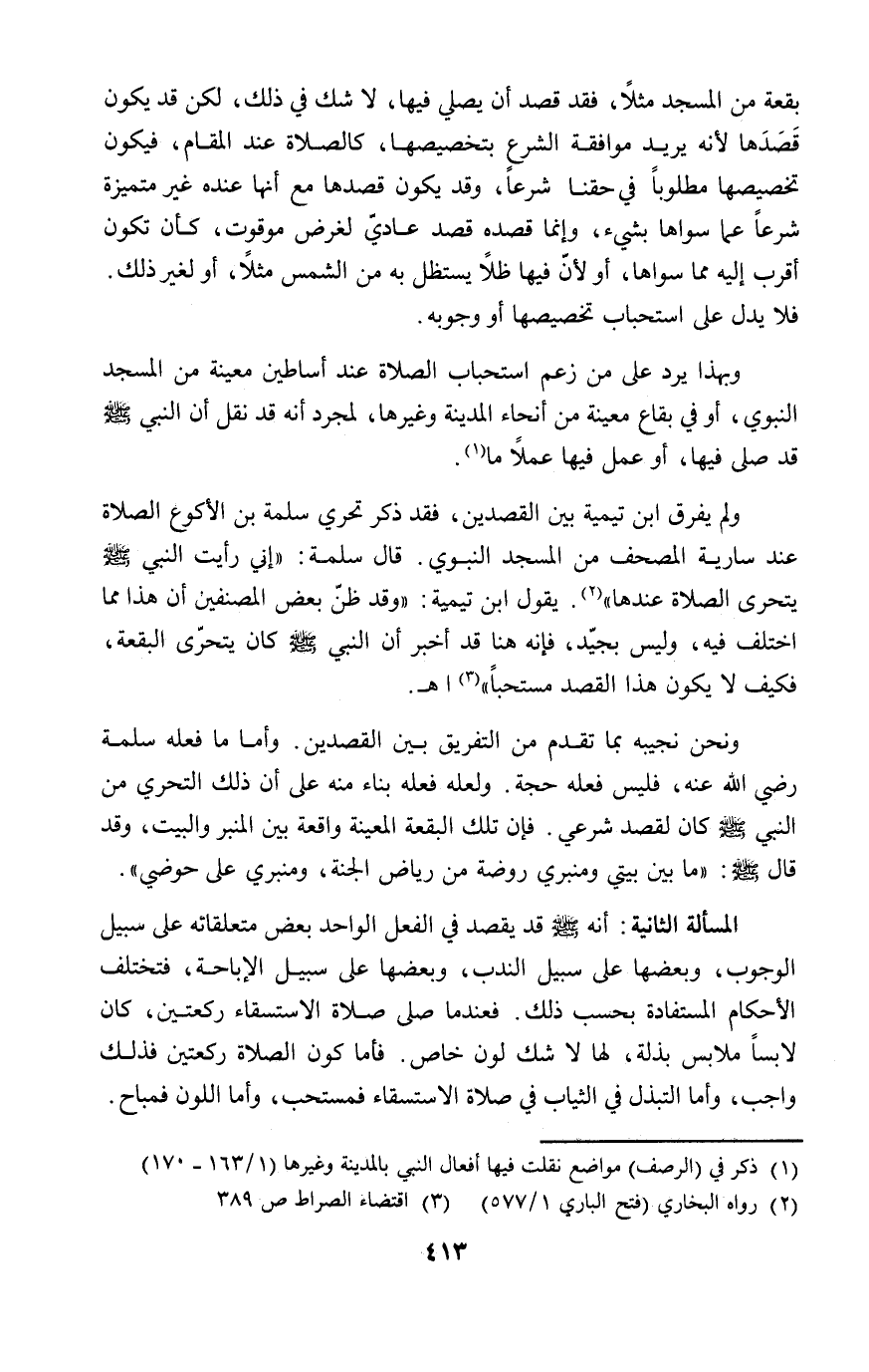 ولم يفرق ابن تيمية بين القصدين، فقد ذكر تحري سلمة بن الأكوع الصلاة عند سارية المصحف من المسجد النبوي. قال سلمة: "إني رأيت النبي - صلى الله عليه وسلم - يتحرى الصلاة عندها" (٢). يقول ابن تيمية: "وقد ظنّ بعض المصنفين أن هذا مما اختلف فيه، وليس بجيّد، فإنه هنا قد أخبر أن النبي - صلى الله عليه وسلم - كان يتحرّى البقعة، فكيف لا يكون هذا القصد مستحباً" (٣) اهـ.