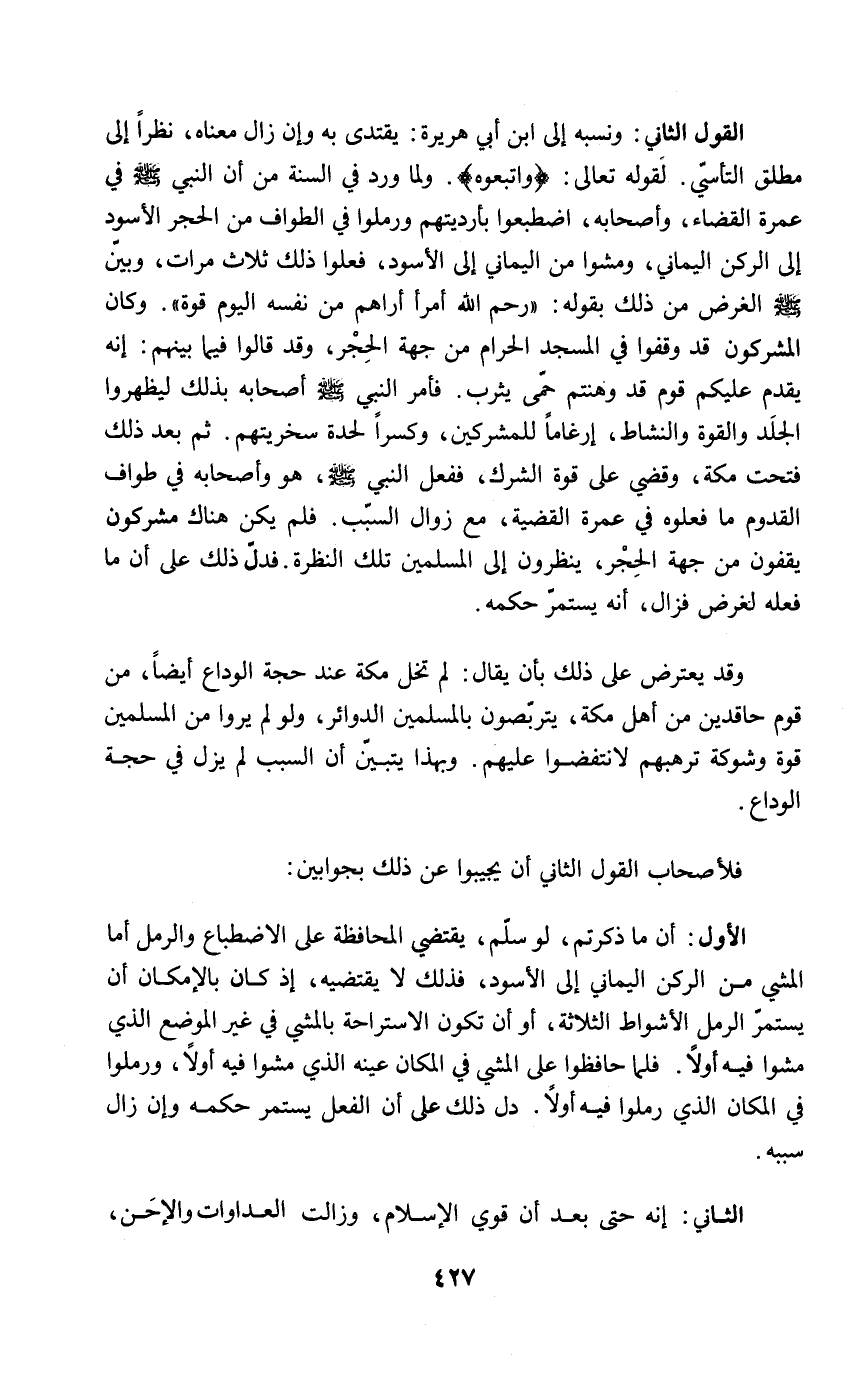 القول الثاني: ونسبه إلى ابن أبي هريرة: يقتدى به وإن زال معناه، نظراً إلى مطلق التأسيّ. لقوله تعالى: {واتبعوه}. ولما ورد في السنة من أن النبي - صلى الله عليه وسلم - في عمرة القضاء، وأصحابه، اضطبعوا بأرديتهم ورملوا في الطواف من الحجر الأسود إلى الركن اليماني، ومشوا من اليماني إلى الأسود، فعلوا ذلك ثلاث مرات، وبيّن - صلى الله عليه وسلم - الغرض من ذلك بقوله: "رحم الله أمرأ أراهم من نفسه اليوم قوة". وكان المشركون قد وقفوا في المسجد الحرام من جهة الحِجْر، وقد قالوا فيما بينهم: إنه يقدم عليكم قوم قد وهنتم حمّى يثرب. فأمر النبي - صلى الله عليه وسلم - أصحابه بذلك ليظهروا الجلَد والقوة والنشاط، إرغاماً للمشركين، وكسراً لحدة سخريتهم. ثم بعد ذلك فتحت مكة، وقضي على قوة الشرك، ففعل النبي - صلى الله عليه وسلم -، هو وأصحابه في طواف القدوم ما فعلوه في عمرة القضية، مع زوال السبّب. فلم يكن هناك مشركون يقفون من جهة الحِجْر، ينظرون إلى المسلمين تلك النظرة. فدلّ ذلك على أن ما فعله لغرض فزال، أنه يستمرّ حكمه.