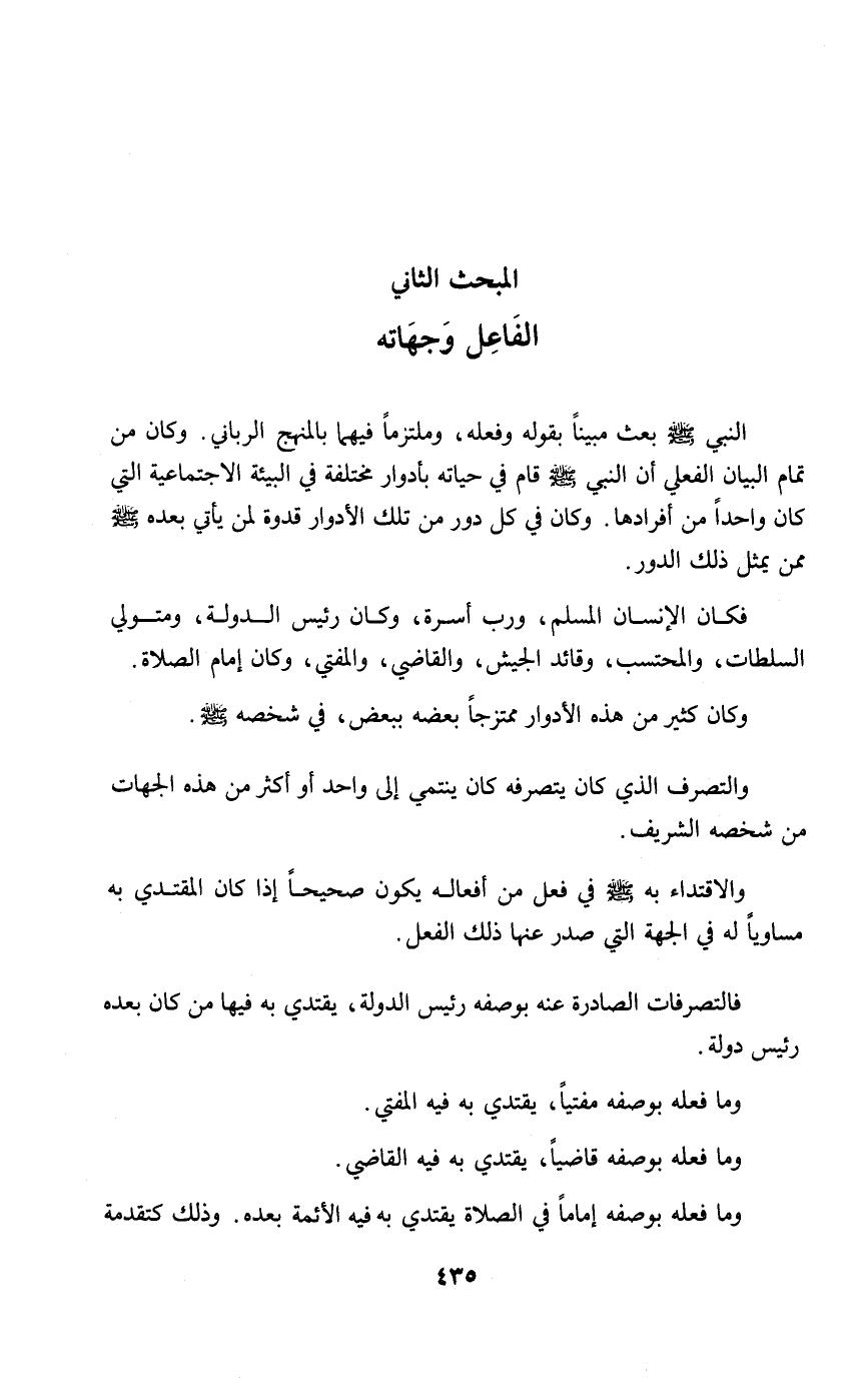 النبي - صلى الله عليه وسلم - بعث مبيناً بقوله وفعله، وملتزماً فيهما بالمنهج الرباني. وكان من تمام البيان الفعلي أن النبي - صلى الله عليه وسلم - قام في حياته بأدوار مختلفة في البيئة الاجتماعية التي كان واحداً من أفرادها. وكان في كل دور من تلك الأدوار قدوة لمن يأتي بعده - صلى الله عليه وسلم - ممن يمثل ذلك الدور.