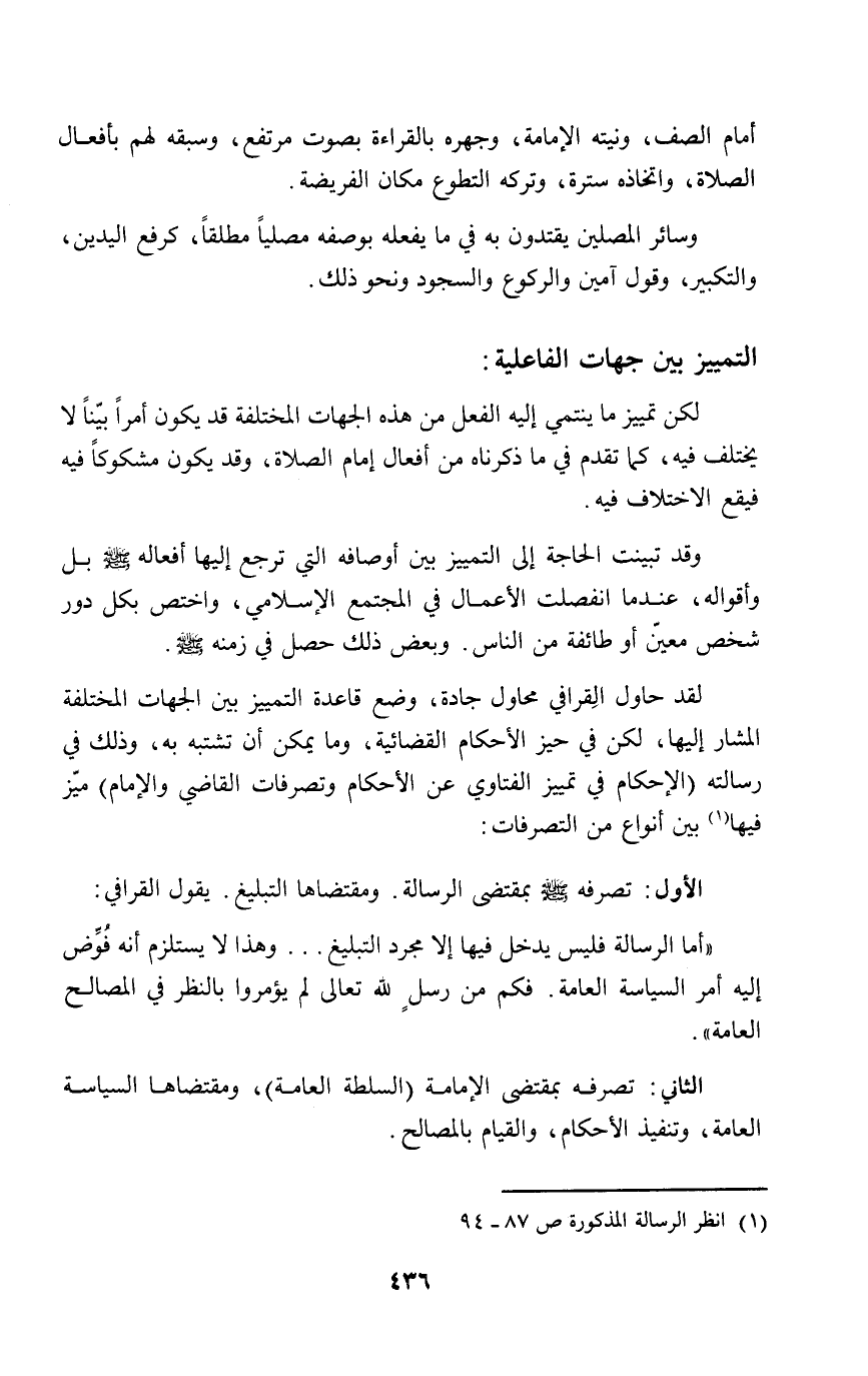 لقد حاول الِقرافي محاول جادة، وضع قاعدة التمييز بين الجهات المختلفة المشار إليها، لكن في حيز الأحكام القضائية، وما يمكن أن تشتبه به، وذلك في رسالته (الإحكام في تمييز الفتاوي عن الأحكام وتصرفات القاضي والإمام) ميّز فيها (١) بين أنواع من التصرفات: