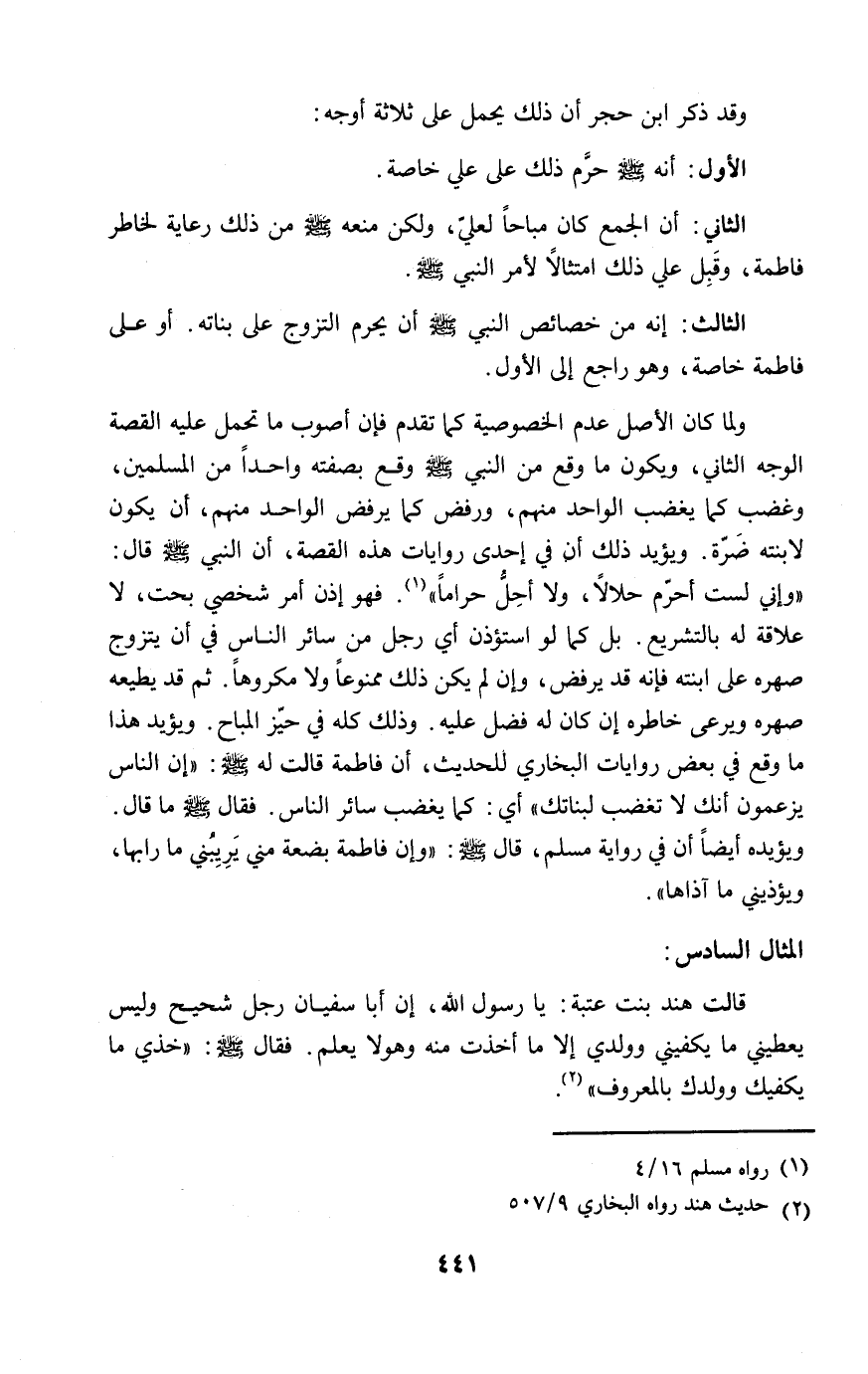 ولما كان الأصل عدم الخصوصية كما تقدم فإن أصوب ما تحمل عليه القصة الوجه الثاني، ويكون ما وقع من النبي - صلى الله عليه وسلم - وقع بصفته واحداً من المسلمين، وغضب كما يغضب الواحد منهم، ورفض كما يرفض الواحد منهم، أن يكون لابنته ضَرّة. ويؤيد ذلك أن في إحدى روايات هذه القصة، أن النبي - صلى الله عليه وسلم - قال: "وإني لست أحرّم حلالاً، ولا أحِلُّ حراماً" (١). فهو إذن أمر شخصي بحت، لا علاقة له بالتشريع. بل كما لو استؤذن أي رجل من سائر الناس في أن يتزوج صهره على ابنته فإنه قد يرفض، وإن لم يكن ذلك ممنوعاً ولا مكروها. ثم قد يطيعه صهره ويرعى خاطره إن كان له فضل عليه. وذلك كله في حيّز المباح. ويؤيد هذا ما وقع في بعض روايات البخاري للحديث، أن فاطمة قالت له - صلى الله عليه وسلم -: "إن الناس يزعمون أنك لا تغضب لبناتك" أي: كما يغضب سائر الناس. فقال - صلى الله عليه وسلم - ما قال. ويؤيده أيضاً أن في رواية مسلم، قال - صلى الله عليه وسلم -: "وإن فاطمة بضعة مني يَرِيِبُني ما رابها، ويؤذيني ما آذاها".