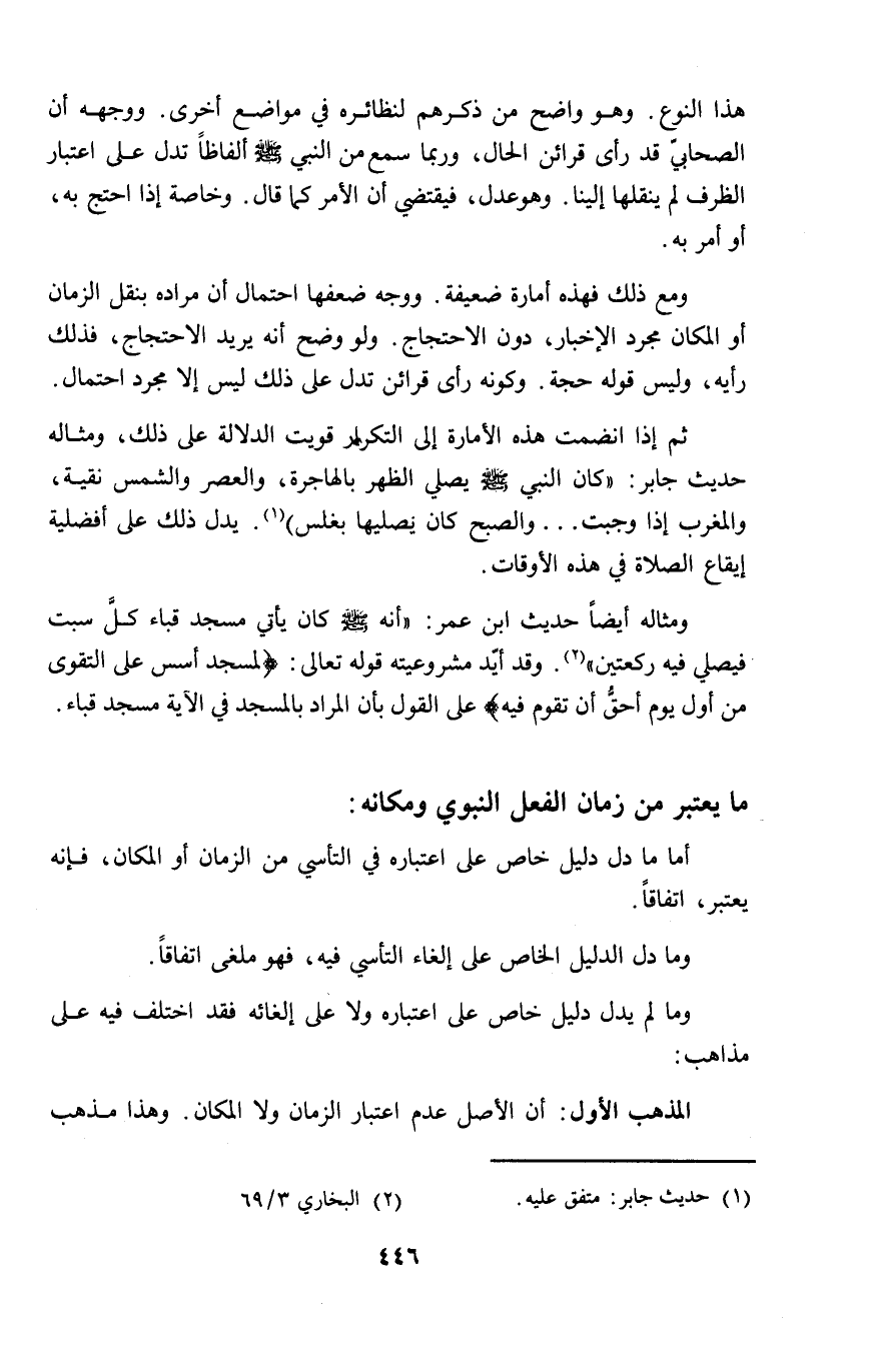 ومثاله أيضاً حديث ابن عمر: "أنه - صلى الله عليه وسلم - كان يأتي مسجد قباء كلَّ سبت فيصلي فيه ركعتين" (٢). وقد أيّد مشروعيته قوله تعالى: {لمسجد أسس على التقوى من أول يوم أحقُّ أن تقوم فيه} على القول بأن المراد بالمسجد في الآية مسجد قباء.