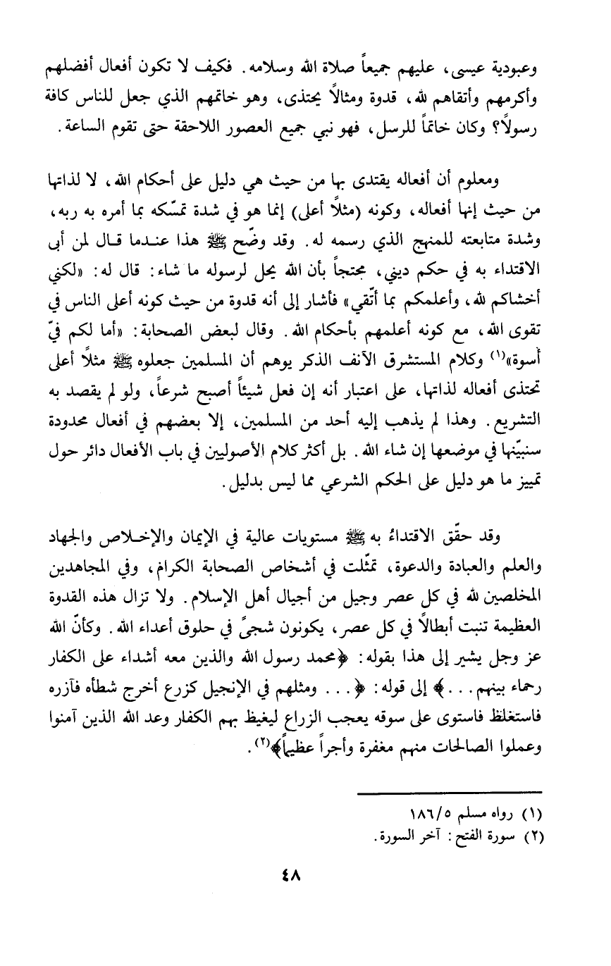 وعبودية عيسى، عليهم جميعاً صلاة الله وسلامه. فكيف لا تكون أفعال أفضلهم وأكرمهم وأتقاهم لله، قدوة ومثالاً يحتذى، وهو خاتمهم الذي جعل للناس كافة رسولاً؟ وكان خاتماً للرسل، فهو نبي جميع العصور اللاحقة حتى تقوم الساعة.