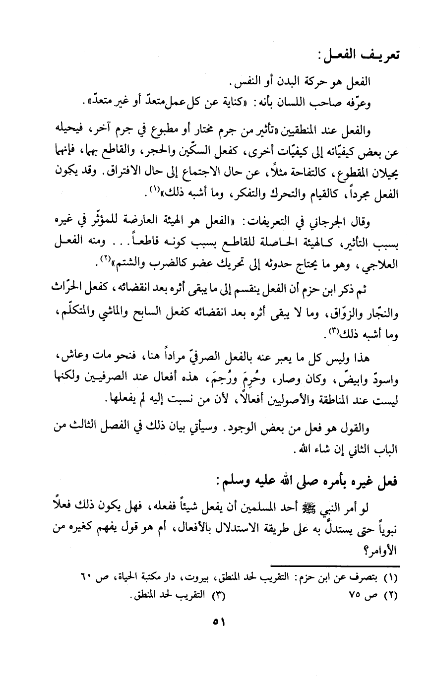 هذا وليس كل ما يعبر عنه بالفعل الصرفيّ مراداً هنا، فنحو مات وعاش، واسودّ وابيضّ، وكان وصار، وحُرِمَ ورُحِمَ، هذه أفعال عند الصرفيين ولكنها ليست عند المناطقة والأصوليين أفعالاً، لأن من نسبت إليه لم يفعلها.