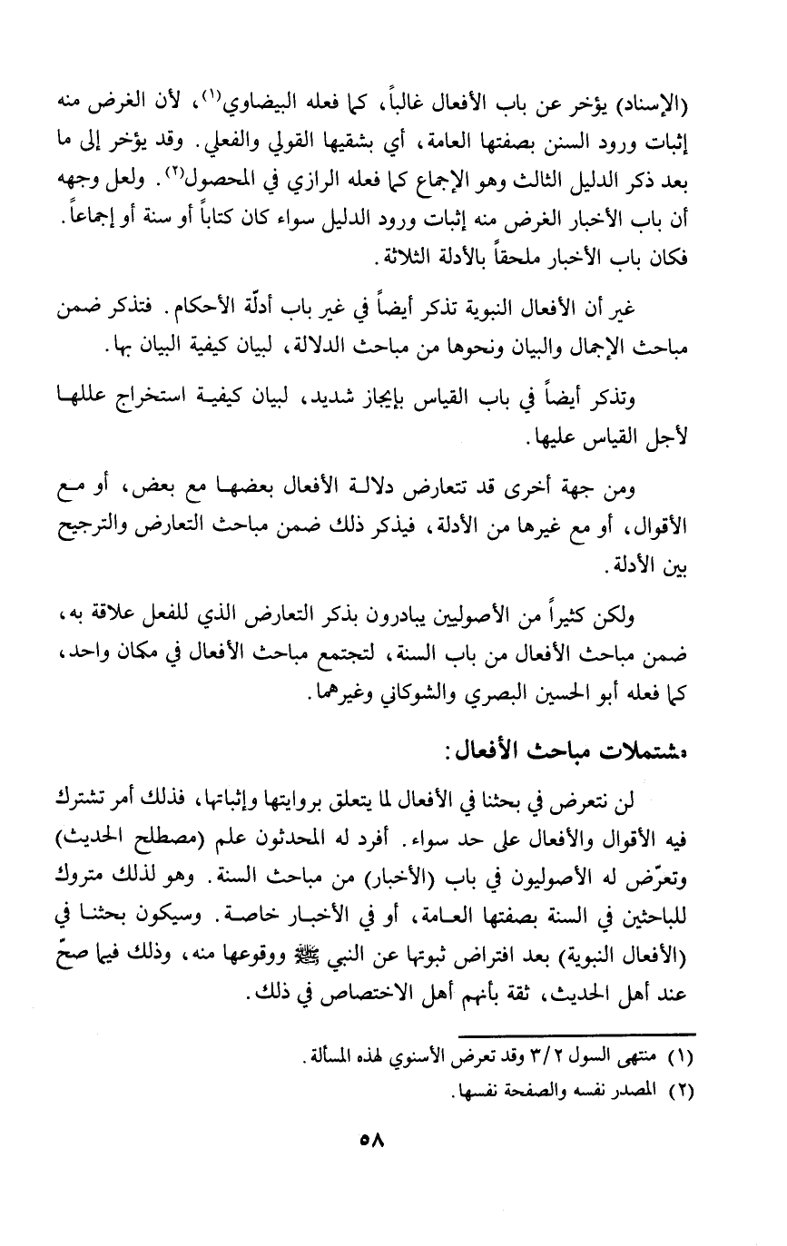 (الإسناد) يؤخر عن باب الأفعال غالباً، كما فعله البيضاوي (١)، لأن الغرض منه إثبات ورود السنن بصفتها العامة، أي بشقيها القولي والفعلي. وقد يؤخر إلى ما بعد ذكر الدليل الثالث وهو الإجماع كما فعله الرازي في المحصول (٢). ولعل وجهه أن باب الأخبار الغرض منه إثبات ورود الدليل سواء كان كتاباً أو سنة أو إجماعاً. فكان باب الأخبار ملحقاً بالأدلة الثلاثة.