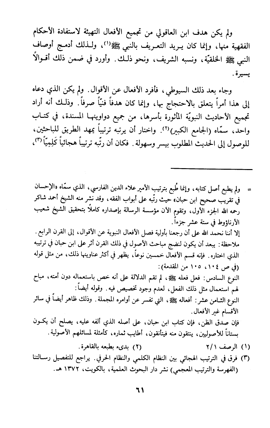 إلا أننا نحمد الله على أن رجعنا بأولية فصل الأفعال النبوية عن الأقوال، إلى القرن الرابع. ملاحظة: يبعد أن يكون لنضج مباحث الأصول في ذلك القرن أثر على ابن حبان في ترتيبه الذي اختاره. فإنه قسم الأفعال خمسين نوعاً، يظهر في أكثر عناوينها ذلك، من مثل قوله (في ص ١٠٤، ١٠٥ من المقدمة):