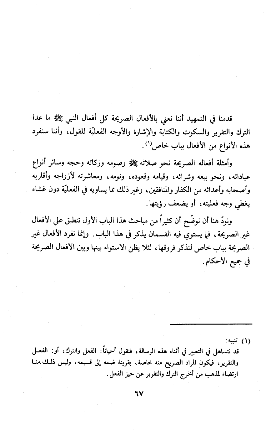 قد نتساهل في التعبير في أثناء هذه الرسالة، فنقول أحياناً: الفعل والترك، أو: الفعل والتقرير، فيكون المراد الصريح منه خاصة، بقرينة ضمه إلى قسيمه، وليس ذلك منا ارتضاء لمذهب من أخرج الترك والتقرير عن حيز الفعل.