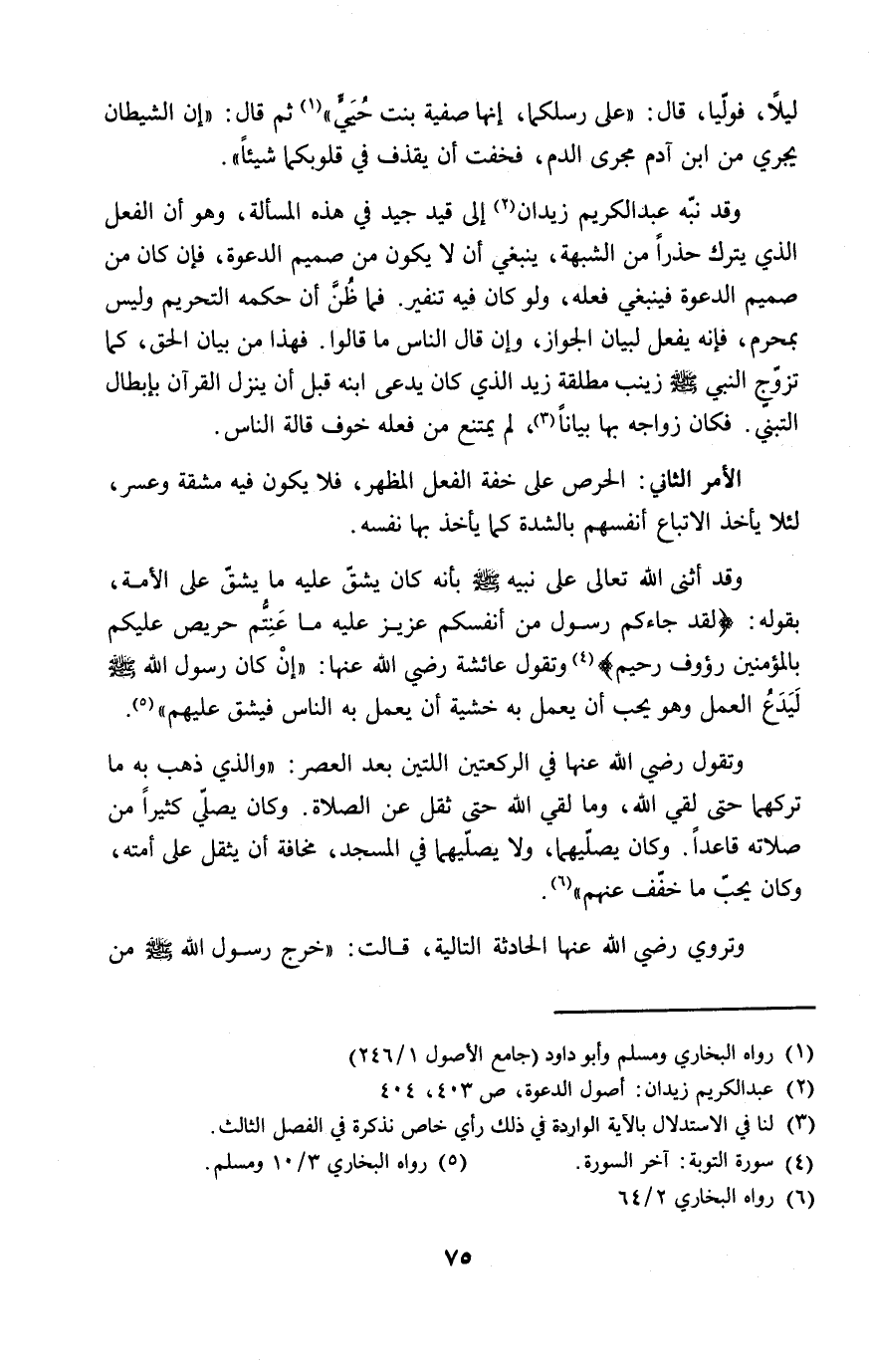 وقد نبّه عبد الكريم زيدان (٢) إلى قيد جيد في هذه المسألة، وهو أن الفعل الذي يترك حذراً من الشبهة، ينبغي أن لا يكون من صميم الدعوة، فإن كان من صميم الدعوة فينبغي فعله، ولوكان فيه تنفير. فما ظُنَّ أن حكمه التحريم وليس بمحرم، فإنه يفعل لبيان الجواز، وإن قال الناس ما قالوا. فهذا من بيان الحق، كما تزوّج النبي - صلى الله عليه وسلم - زينب مطلقة زيد الذي كان يدعى ابنه قبل أن ينزل القرآن بإبطال التبني. فكان زواجه بها بياناً (٣)، لم يمتنع من فعله خوف قالة الناس.