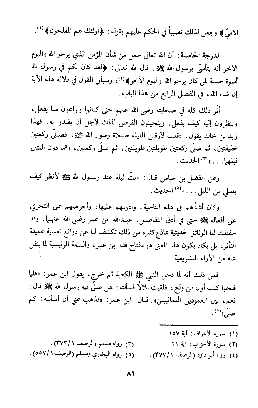الدرجة الخامسة: أن الله تعالى جعل من شأن المؤمن الذي يرجو الله واليوم الآخر أنه يتأسّى برسول الله - صلى الله عليه وسلم -. قال الله تعالى: {لقد كان لكم في رسول الله أسوة حسنة لمن كان يرجو الله واليوم الآخر} (٢)، وسيأتي القول في دلالة هذه الآية إن شاء الله، في الفصل الرابع من هذا الباب.