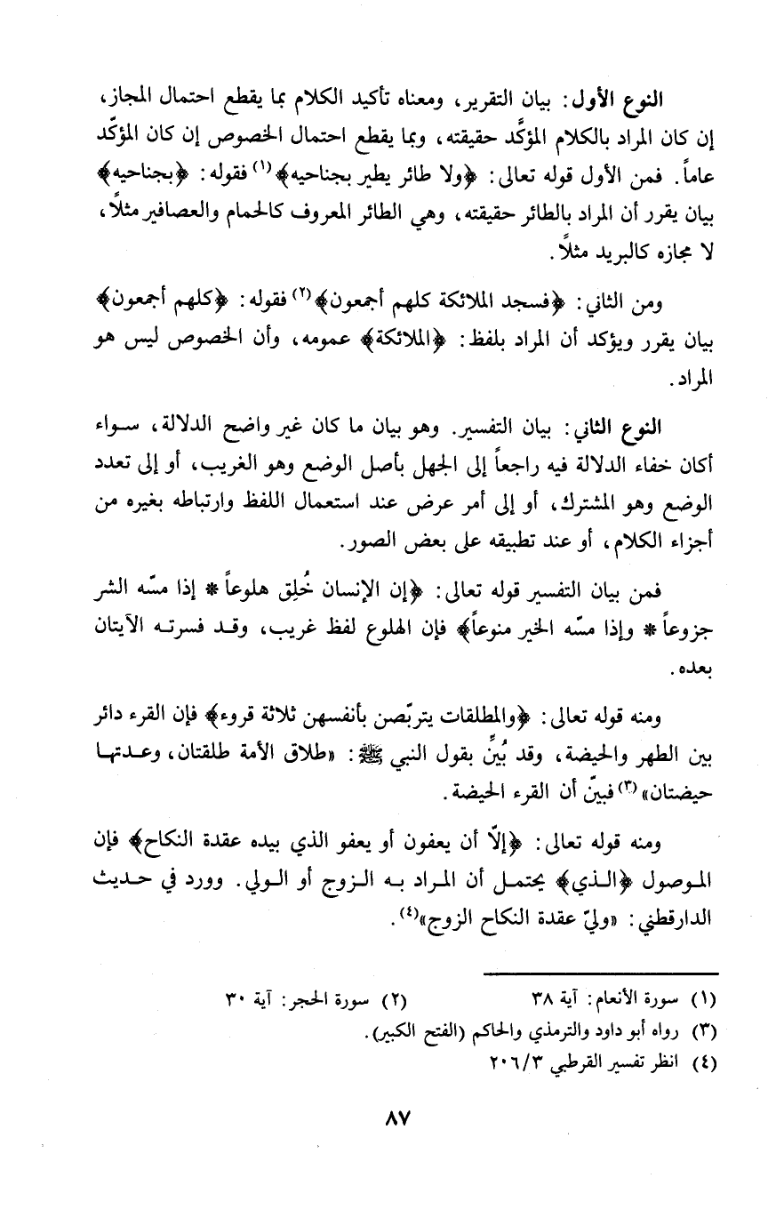النوع الأول: بيان التقرير، ومعناه تأكيد الكلام بما يقطع احتمال المجاز، إن كان المراد بالكلام المؤكَّد حقيقته، وبما يقطع احتمال الخصوص إن كان المؤكّد عاماً. فمن الأول قوله تعالى: {ولا طائر يطير بجناحيه} (١) فقوله: {بجناحيه} بيان يقرر أن المراد بالطائر حقيقته، وهي الطائر المعروف كالحمام والعصافير مثلاً، لا مجازه كالبريد مثلاً.