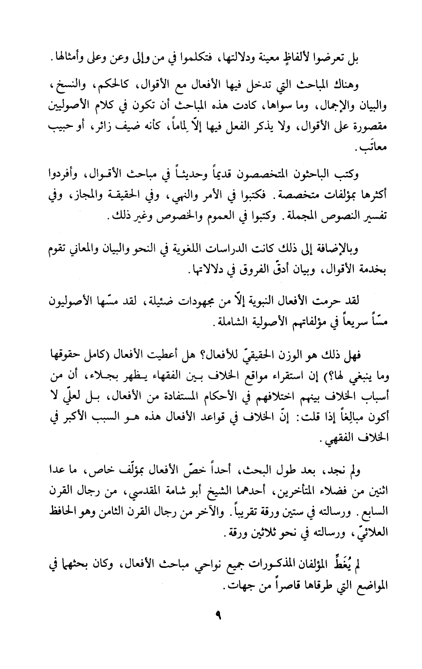 ولم نجد، بعد طول البحث، أحداً خصّ الأفعال بمؤلّف خاص، ما عدا اثنين من فضلاء المتأخرين، أحدهما الشيخ أبو شامة المقدسي، من رجال القرن السابع. ورسالته في ستين ورقة تقريباً. والآخر من رجال القرن الثامن وهو الحافظ العلائيّ، ورسالته في نحو ثلاثين ورقة.