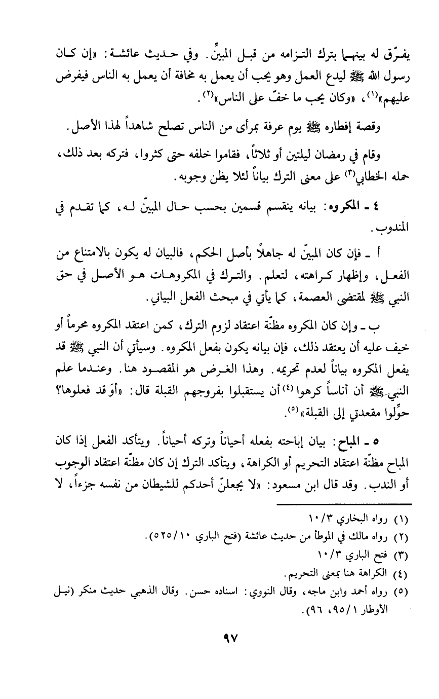 ٥ - المباح: بيان إباحته بفعله أحياناً وتركه أحياناً. ويتأكد الفعل إذا كان المباح مظنّة اعتقاد التحريم أو الكراهة، ويتأكد الترك إن كان مظنّة اعتقاد الوجوب أو الندب. وقد قال ابن مسعود: "لا يجعلنّ أحدكم للشيطان من نفسه جزءاً، لا