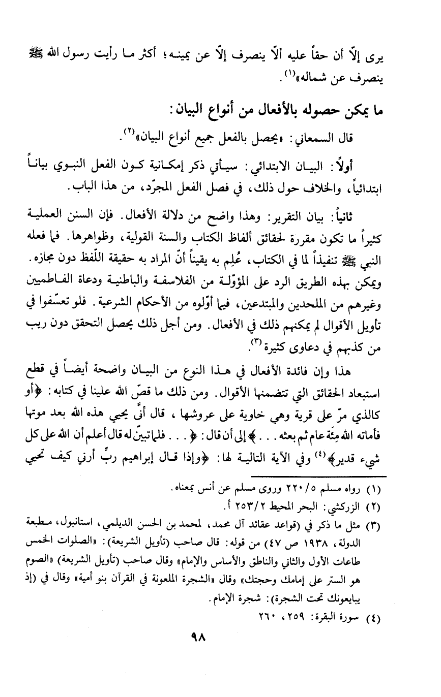 ثانياً: بيان التقرير: وهذا واضح من دلالة الأفعال. فإن السنن العملية كثيراً ما تكون مقررة لحقائق ألفاظ الكتاب والسنة القولية، وظواهرها. فما فعله النبي - صلى الله عليه وسلم - تنفيذاً لما في الكتاب، عُلِم به يقيناً أن المراد به حقيقة اللّفظ دون مجازه. ويمكن بهذه الطريق الرد على المؤوّلة من الفلاسفة والباطنية ودعاة الفاطميين وغيرهم من الملحدين والمبتدعين، فيما أوّلوه من الأحكام الشرعية. فلو تعسّفوا في تأويل الأقوال لم يمكنهم ذلك في الأفعال. ومن أجل ذلك يحصل التحقق دون ريب من كذبهم في دعاوى كثيرة (٣).