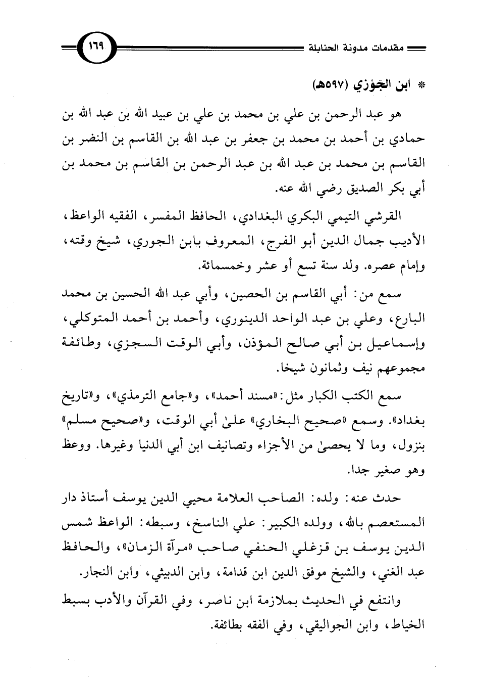 القرشي التيمي البكري البغدادي، الحافظ المفسر، الفقيه الواعظ، الأديب جمال الدين أبو الفرج، المعروف بابن الجوري، شيخ وقته، وإمام عصره. ولد سنة تسع أو عشر وخمسمائة.