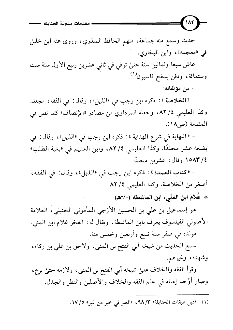 - "كتاب العمدة": ذكره ابن رجب في "الذيل"، وقال: في الفقه، أصغر من الخلاصة. وكذا العليمي 4/ 82.