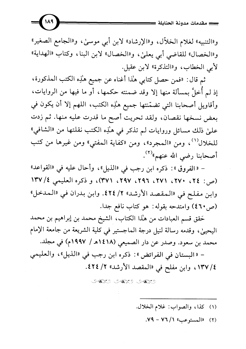 و"التنبيه" لغلام الخلاّل، و"الإرشاد" لابن أبي موسى، و"الجامع الصغير" و"الخصال" للقاضي أبي يعلى، و"الخصال" لابن البنا، وكتاب "الهداية" لأبي الخطاب، و"التذكرة" لابن عقيل.