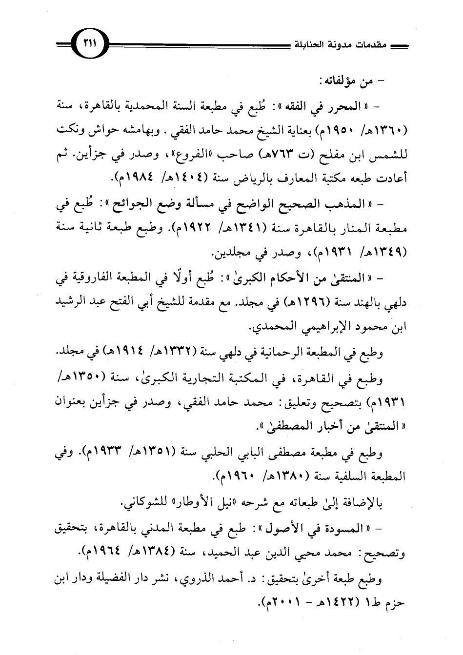 - " المحرر في الفقه": طُبع في مطبعة السنة المحمدية بالقاهرة، سنة (1360 هـ/ 1950 م) بعناية الشيخ محمد حامد الفقي. وبهامشه حواش ونكت للشمس ابن مفلح (ت 763 هـ) صاحب "الفروع"، وصدر في جزأين. ثم أعادت طبعه مكتبة المعارف بالرياض سنة (1404 هـ/ 1984 م).