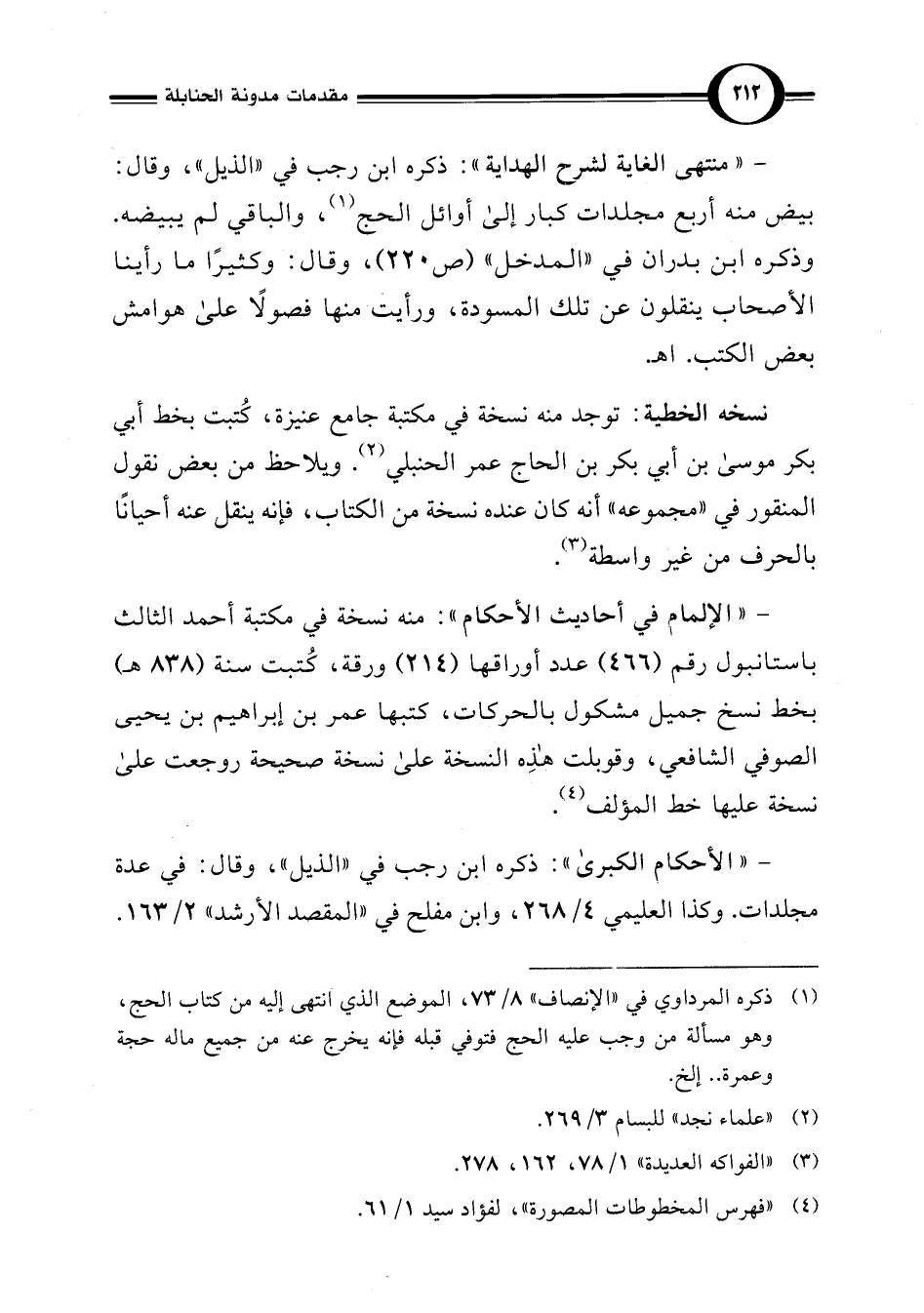 - "منتهى الغاية لشرح الهداية": ذكره ابن رجب في "الذيل"، وقال: بيض منه أربع مجلدات كبار إلى أوائل الحج (¬1)، والباقي لم يبيضه. وذكره ابن بدران في "المدخل" (ص 220)، وقال: وكثيرًا ما رأينا الأصحاب ينقلون عن تلك المسودة، ورأيت منها فصولًا على هوامش بعض الكتب. اهـ.