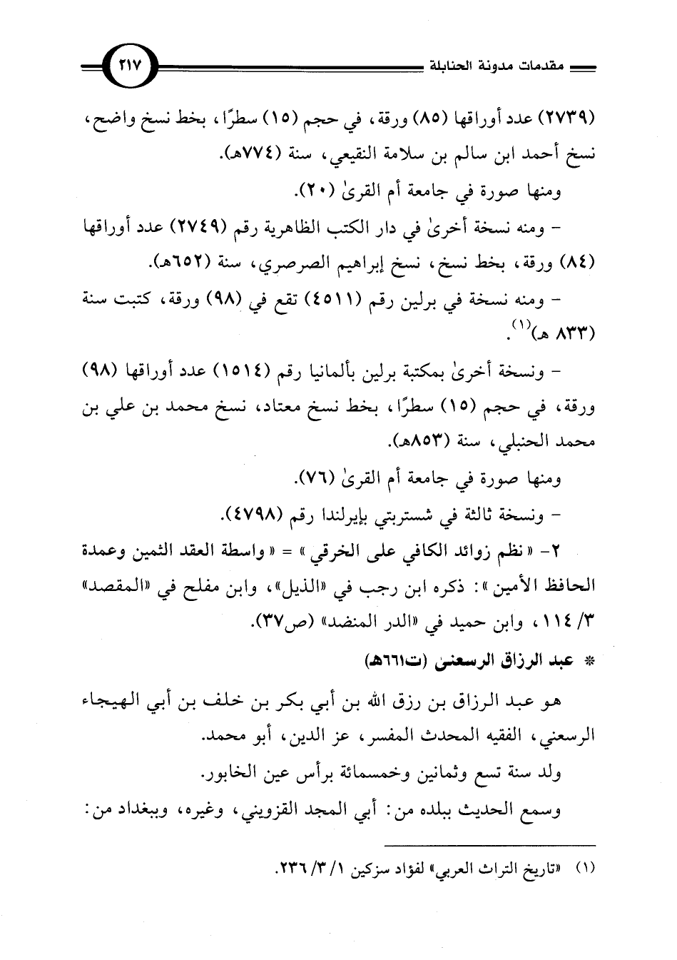 2 - "نظم زوائد الكافي على الخرقي" = "واسطة العقد الثمين وعمدة الحافظ الأمين": ذكره ابن رجب في "الذيل"، وابن مفلح في "المقصد" 3/ 114، وابن حميد في "الدر المنضد" (ص 37).