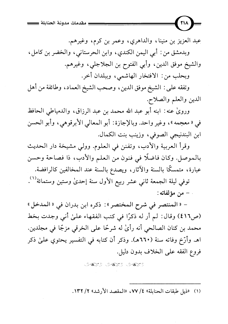 (¬1) "ذيل طبقات الحنابلة" 4/ 77، "المقصد الأرشد" 2/ 132.