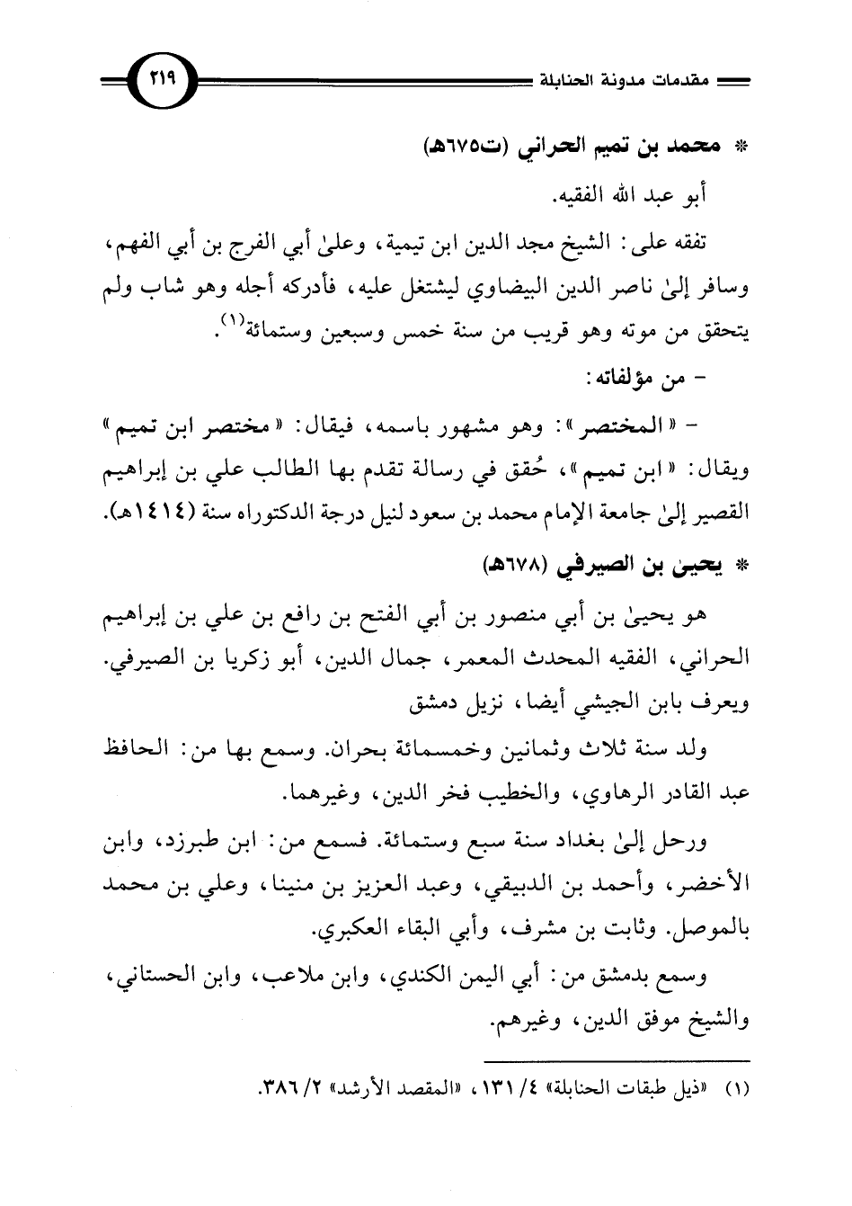 (¬1) "ذيل طبقات الحنابلة" 4/ 131، "المقصد الأرشد" 2/ 386.